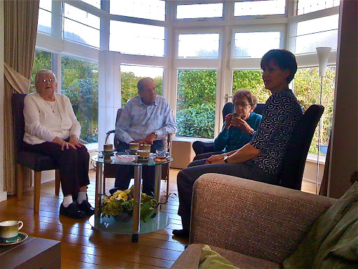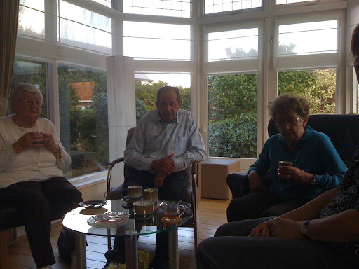 Op zondag 4 oktober, een week voor de terugreis, bezochten ze voor het eerst Balgoy. Lekker gezellig in de serre, werden de nodige herinneringen boven tafel gehaald. Ome Gerrit en tante Marietje zijn allebei boven de tachtig, mijn moeder is 79 jaar oud, maar toch is dat nog jong vergeleken met nummer vier op de foto beneden. Harrie Jans, mijn schoonvader, werd 19 september 97 jaar………..