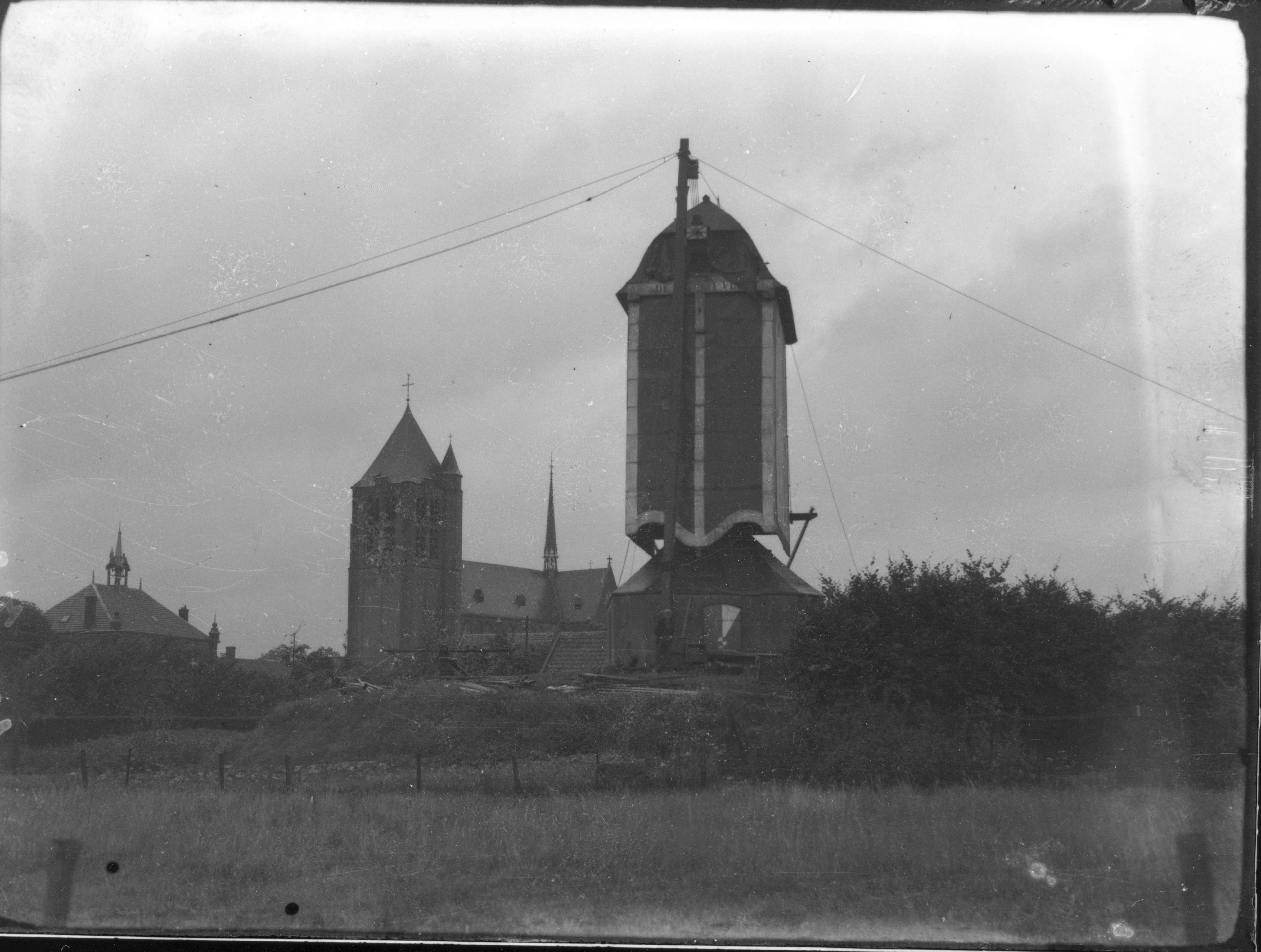 Op een andere foto, gemaakt voor 1930 (getuige het hoge spitse Angelustorentje op de kerk), is deze steile molenberg wel zichtbaar.