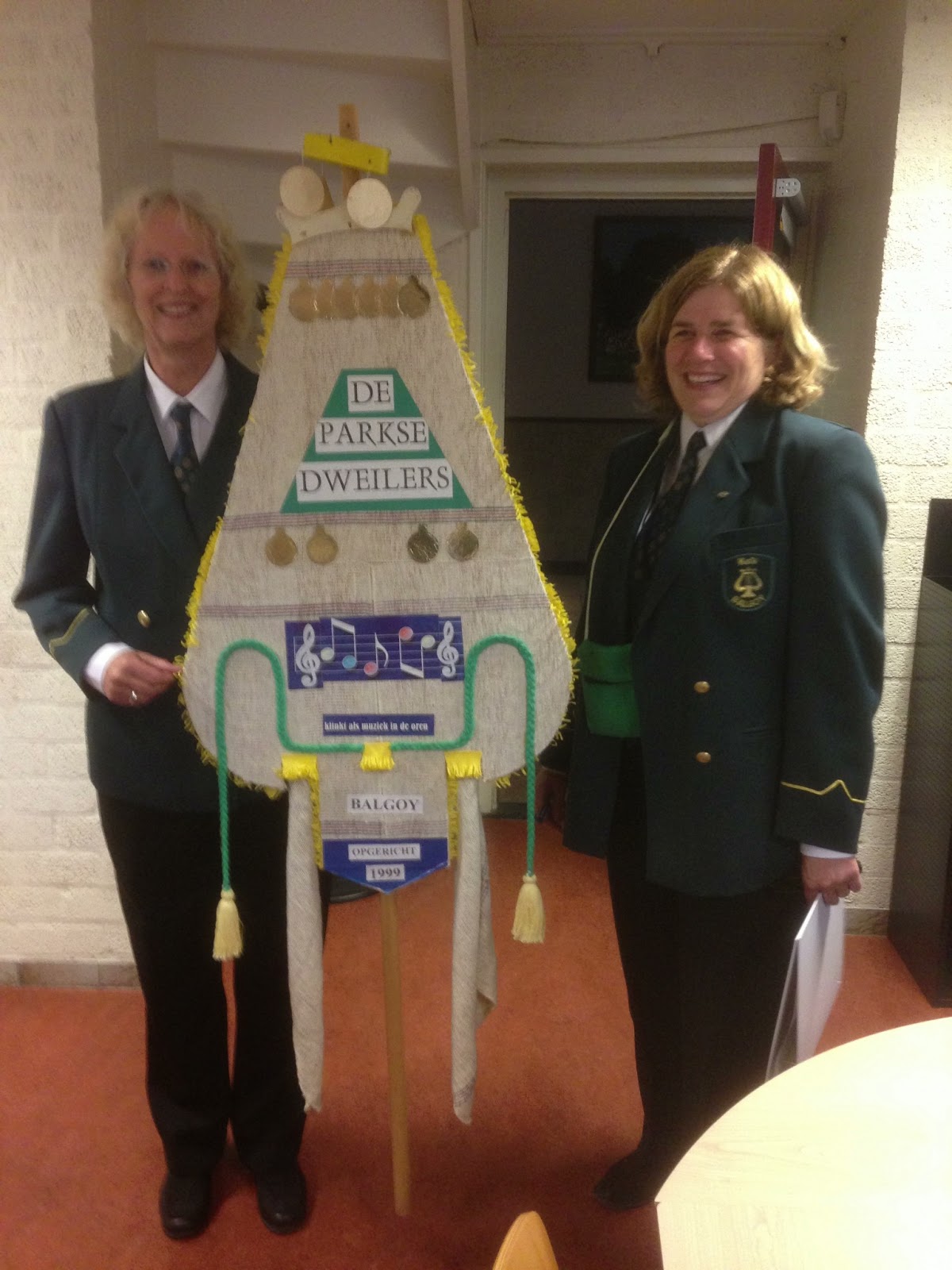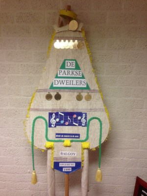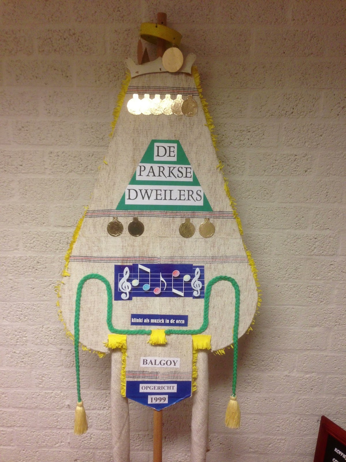 Marcel en Saskia Mattheijer zijn nieuwe Balgoyse minse, die op de Hoeve zijn komen wonen in het huis van Wim Verhoeven, na diens overlijden in maart 2012. Op de zolder vonden zij nog wat achtergebleven spullen, waaronder het voorwerp wat op de foto is te zien. Toen leden van de harmonie gisteren op bezoek waren vanwege de donateursactie, kregen zij het voorwerp mee, omdat duidelijk is dat het een Balgoy’s vaandel moet voorstellen wat toe lijkt te behoren aan een muziekgezelschap of dweilorkest. Het kan bijna niet anders dan dat het “vaandel” door Wim Verhoeven is gemaakt.