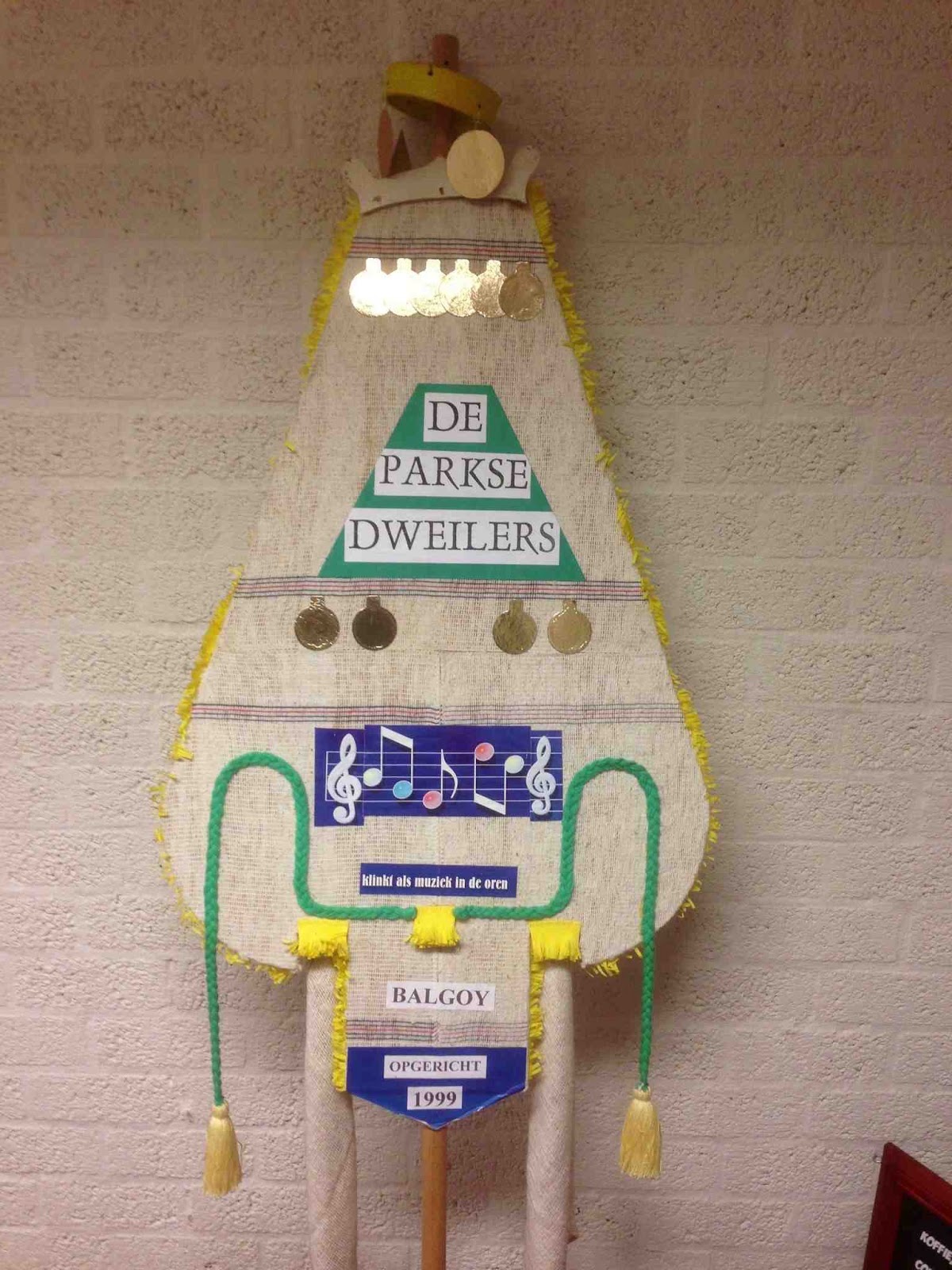 Mooi, want dat betekent dat we het vaandel dat de nieuwe overbuurman van Teun op zolder vond toen hij zijn nieuwe huis in de Hoeve betrok, weer zouden kunnen gebruiken. Gemaakt door Wim Verhoeven in 1999: Het verrassingsjaar van prins Marcel I. De carnavalsoptocht is dat jaar evenals andere jaren weer een spektakel. Mooi versierde wagens en grappig uitgedoste loopgroepen. Heel wat uren noeste arbeid, maar het resultaat mag er wezen. Behalve Kunst en Vriendschap, de Balgoyse muziekvereniging, die traditiegetrouw voorop loopt in de bonte stoet, is er dat jaar ook een dweilorkest van de partij. Het is dweilorkest de Parkse dweilers uit de Hoeve (insiders zullen de link naar de prins zeker snappen) met een prachtig vaandel, gebaseerd op het oude vaandel van de harmonie. Tip: Dit vaandel kan dit dweiljoar dus weer mooi gebruikt worden in de optocht!