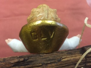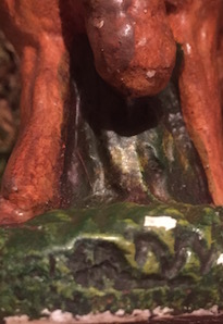 Samen met Wim naar de kerk dus en naar de kerststal om te kijken of die ook van Pietro Mazzotti is. Wim bekeek de beeldengroep van afstand en was meteen overtuigd dat het inderdaad beelden waren van Mazzotti. Bij nadere inspectie, was er toch ook wel wat twijfel, want de beelden waren deels overschilderd en er waren ook zeker beelden bij, met name een aantal schapen, die met zekerheid niet tot de originele beeldengroep behoorden. Op zoek naar een merkteken, want dan heb je meer zekerheid. En inderdaad op een paar beelden, die ook gelijkenis vertoonden met de beelden van Wim thuis, werd een merkteken gevonden. Op anderen niet, wat volgens Wim niet hoeft te betekenen dat ze niet origineel zijn, want niet alle beelden van een groep werden voorzien van een merkteken. Tevreden naar huis dus, met de nieuwe kennis dat de kerstgroep in onze kerk in het begin van de twintigste eeuw is vervaardigd in Münster en dus naar alle waarschijnlijkheid is aangeschaft voor de nieuwe kerk.