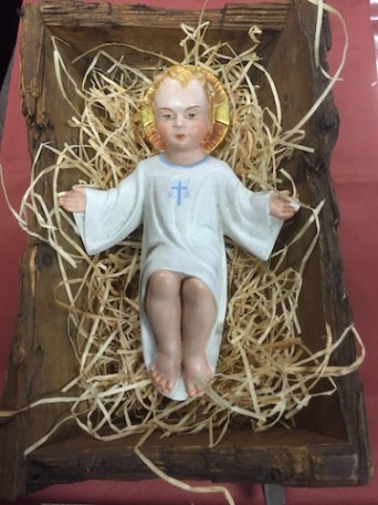 Toch is het verhaal nog niet volledig, want toen Wim en ik de kerststal bekeken, was er nog geen kribbe in de kerststal. Het kerstkind werd pas in de kerststal geplaatst op kerstavond. En wat schetst mijn verbazing toen ik met kerst het beeldje van het kerstkindje bekeek op zoek naar het merkteken PM? Wel een merkteken, maar niet PM! Het merkteken aan het hoofdeinde van het beeldje vermelde GLV. Dat was een verrassing. Wie of wat was GLV? Op de website van Vrienden van de Kerstgroep is een alfabetisch overzicht te vinden van ca. 375 gegevens over merktekens op gipsen Kerstgroepen. GLV wordt vermeld in deze lijst en is het merkteken van Gerard Linssen die in 1893 een gipsenbeelden fabriek oprichtte in Venlo. Daarvoor was hij werkzaam voor beeldenfabriek Schmitt-Heckler in Keulen. Gerard overleed in 1921. Zijn zoon Martin volgde hem op. Dat werd geen succes. In 1931 verkocht Martin Linssen de zaak aan Jos Heintges (merkteken J.H.V.). Het gipsen kerstkindje uit onze kerststal is dus in Venlo vervaardigd, ook in het begin van de vorige eeuw.