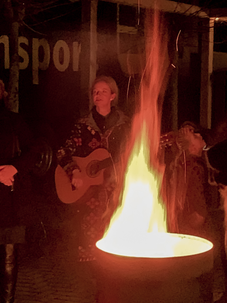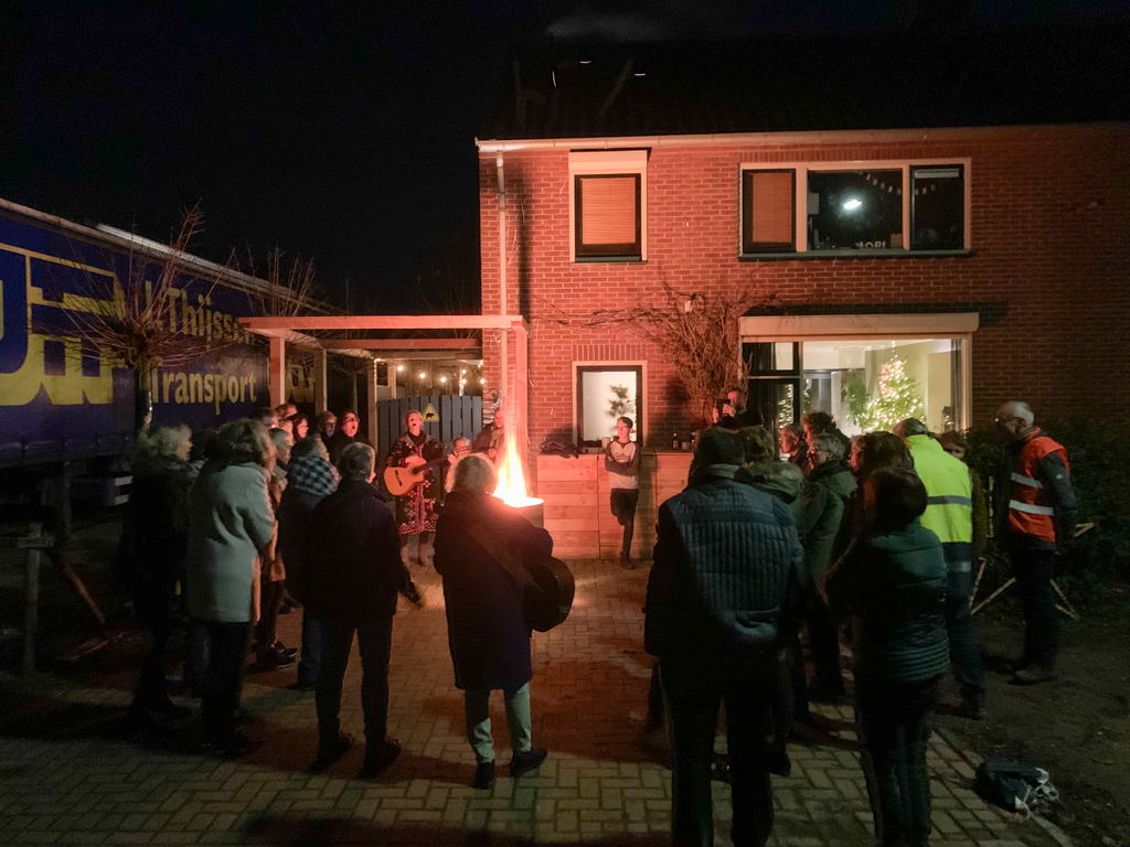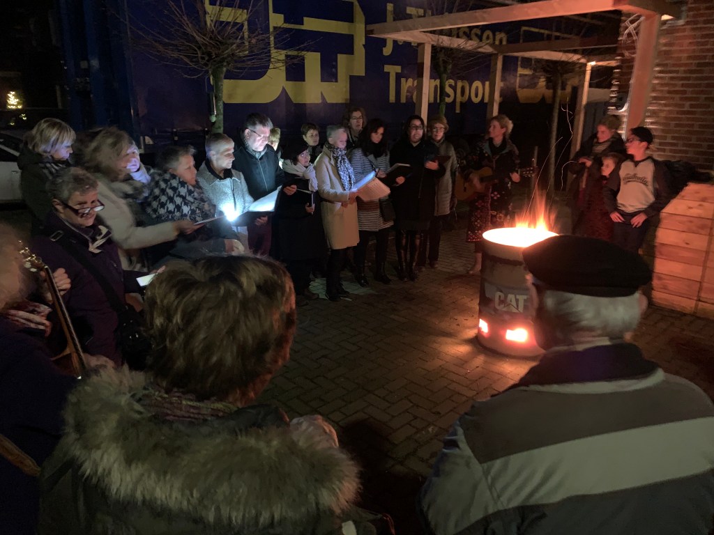 Onder de bezielende leiding van Ilja van Luijk worden bij de spontaan aangestoken vuurton een aantal bekende kerstliederen gezongen, begeleid door twee gitaren. Volgens mij is het koor vorig jaar begonnen met dit initiatief. Een geweldig initiatief! “Het is heel leuk om te doen”, zegt een van de koorleden. “Het is heel mooi om te zien hoe de mensen reageren”, vindt een ander koorlid. “Na verloop van tijd zie je meer en meer nieuwsgierige buren verschijnen”, zegt ze, “Of luisteren mensen met tranen in de ogen.’’