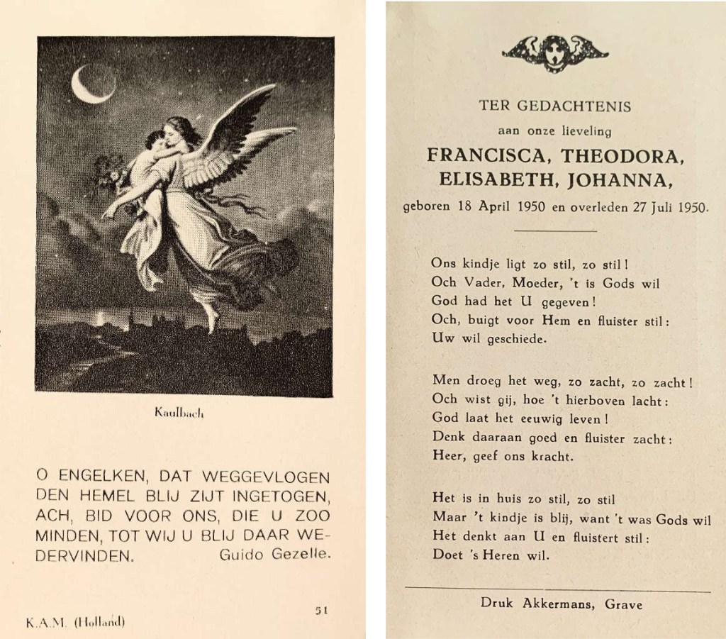 Soms blijft een verhaal als concept voor langere tijd liggen. Dat kan verschillende redenen hebben. Je bent niet helemaal tevreden over de inhoud, je mist nog informatie of je vindt de informatie te gevoelig om meteen openbaar te maken. Dat laatste gevoel had ik toen ik twee jaar geleden met het onderstaande bezig was. Het was zaterdagmorgen en ik snuffelde wat door een verzameling foto’s, envelopjes met kaartjes en bidprentjes afkomstig van de toen pas overleden Theo Willems. Materiaal dat geschikt zou kunnen zijn voor onze heemkundegroep Pagus Balgoye. En dan stuit je op bovenstaand bidprentje in een kerkmissaaltje dat van iemand uit het dorp is geweest. Een kindje dat na 3 maanden overleden is, maar alleen de voornamen zijn vermeld. Geen achternaam dus en ook niet waar het kindje is begraven.