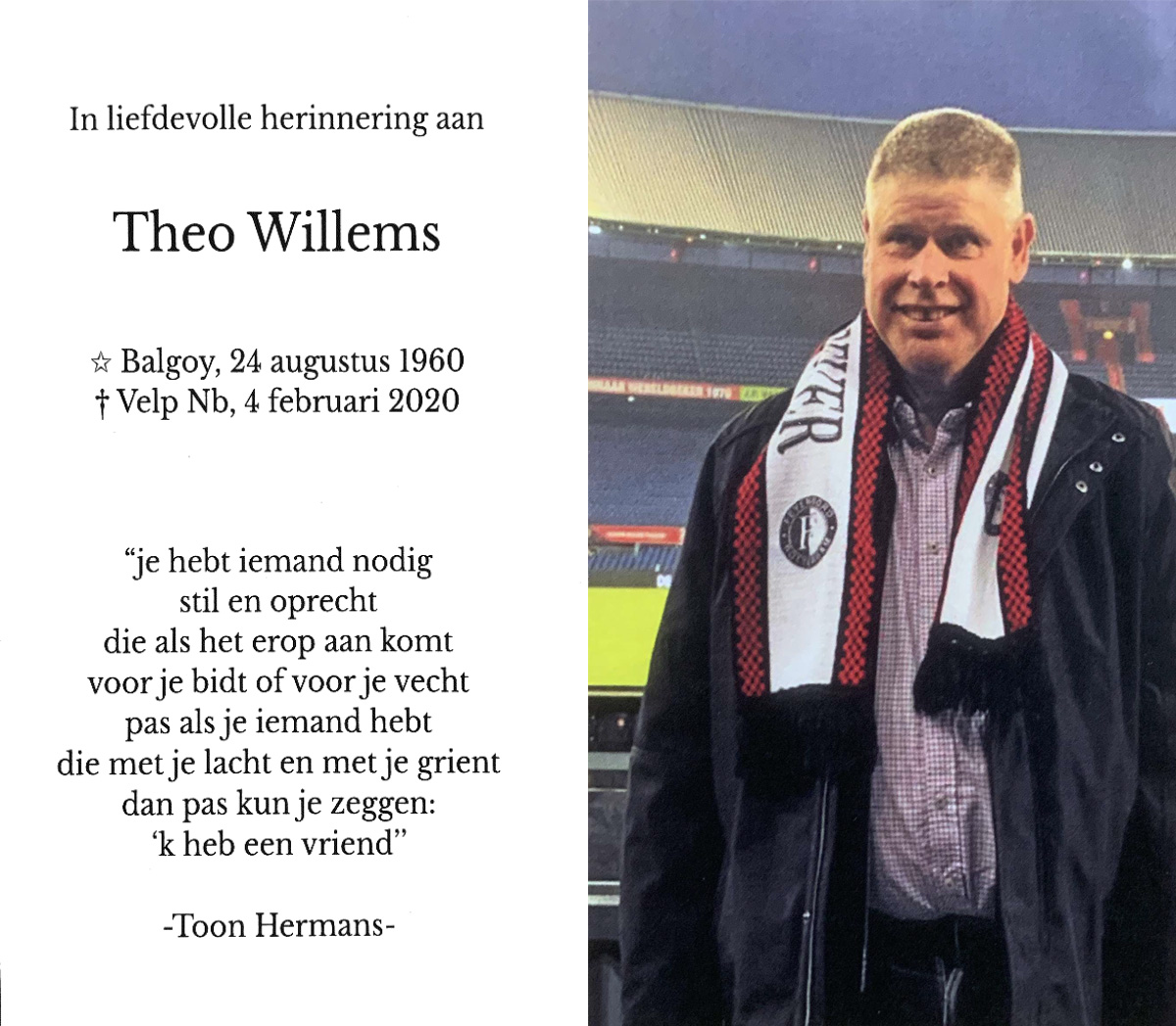 Nadenkend over het plaatsen van dit verhaal, vind ik dat dit een mooi moment is. Theo Willems is zo’n Balgoyse mens die we willen blijven herinneren. We hebben misschien niet allemaal een missaal meer, waarin we bidprentjes verzamelen, maar middels dit verhaal blijft Theo toch nog een beetje bij ons. Hij overleed in de nacht van 4 februari 2020. Zijn laatste boodschap aan de mensen in Balgoy was: “Allemaal genieten met de carnavalsdagen, jong en oud. Groetjes van Theo uit de Veldsestraat”. Dus mensen allemaal genieten volgende week.