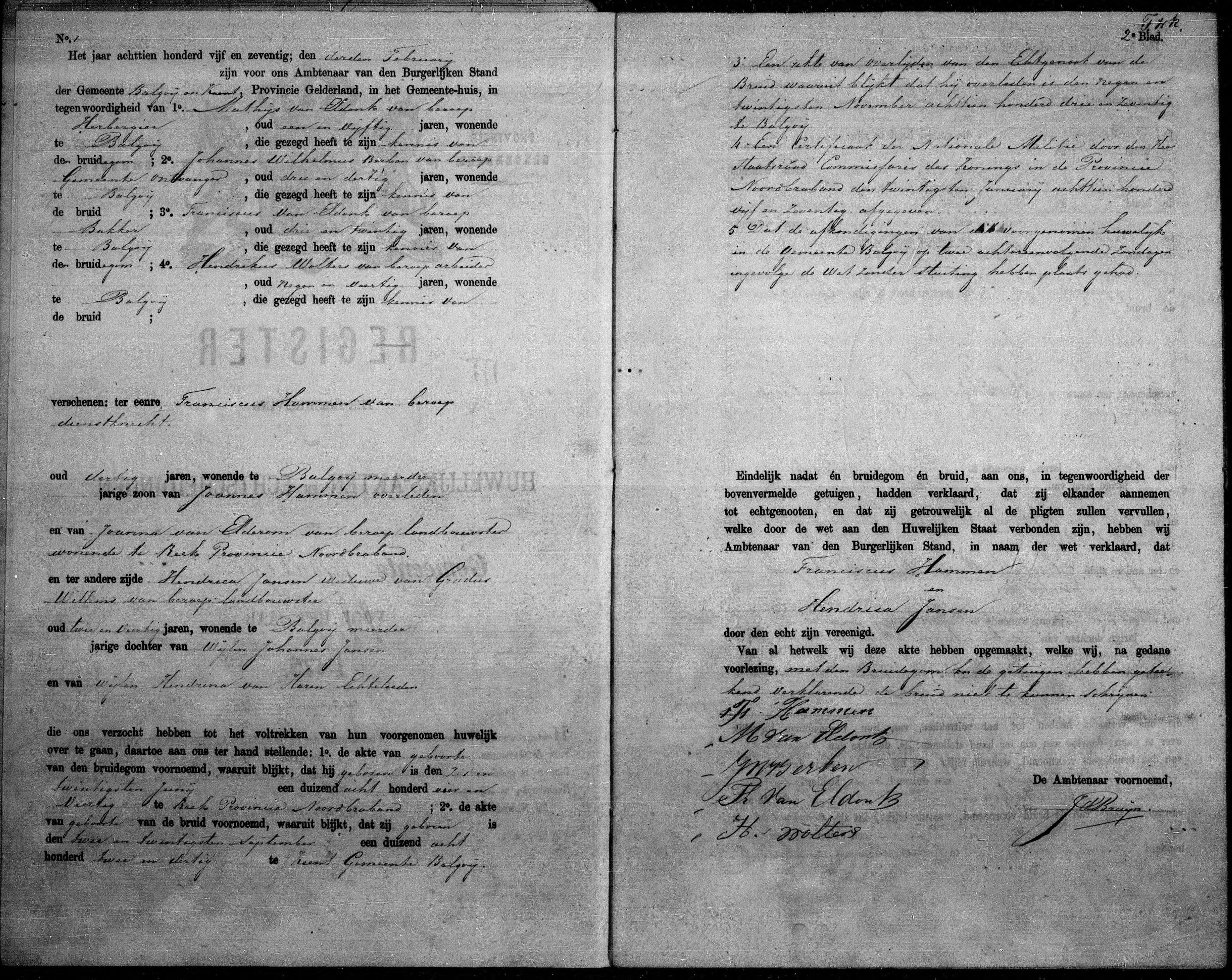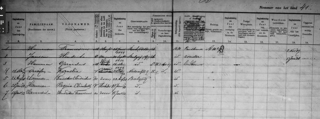 Wie was Francis Hammen en waar kwam hij vandaan? Hij trouwde in 1875 in Balgoy met Hendrina Janssen, weduwe van Gradus Willems (29 november 1873 overleden in Balgoy). In de trouwakte staat dat Francis Hammen van beroep dienstknecht was en geboren was in Reek. Hoe het contact is ontstaan tussen de dertig jarige dienstknecht en de tweeënveertig jarige weduwe is niet duidelijk. In het bevolkingsregister is niet vermeld dat Francis werkzaam was op de boerderij van Gradus Willems en Hendrina Janssen of ergens anders in Balgoy.