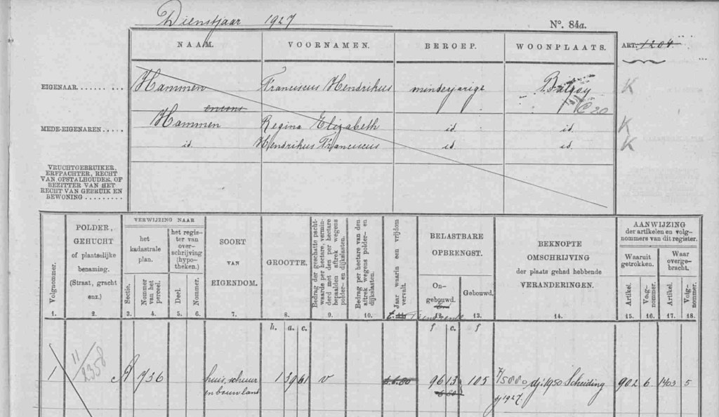 De zonen Henk en Paul wonen nog in het ouderlijk huis van de familie Hammen in de Torenstraat. De boerderij werd gekocht in 1926 (zie kadaster dienstjaar (dj) 1927). Opvallend was dat de boerderij op naam stond van drie minderjarigen, nl. Frans (Franciscus Hendrikus), geboren in 1908, Gien (Regina Elisabeth), geboren in 1910 en Hendrik (Hendrikus Franciscus) Hammen, geboren in 1912.