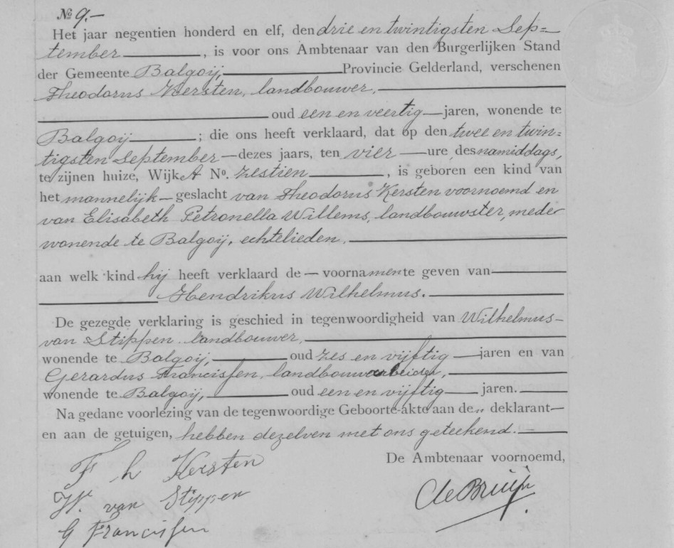 Geboorteakte Hendrikus Wilhelmus Kersten, Balgoy 1911.