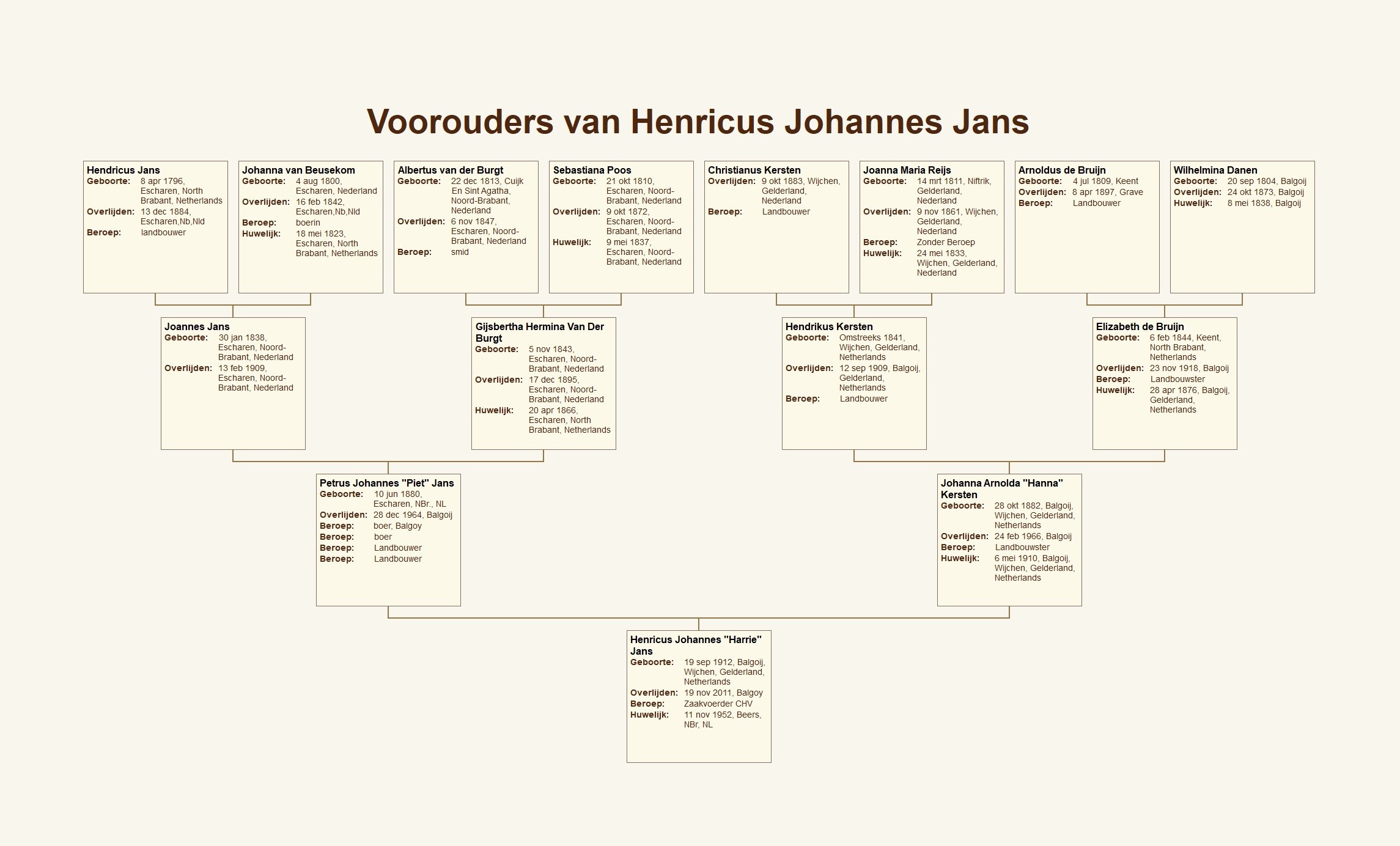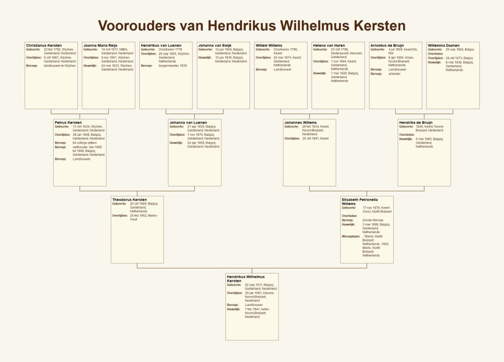 In mijn MyHeritage stamboom Balgoyse minse v1 is te vinden dat Wilhelmina (in aktes van de burgerlijke stand wordt de naam Maria Wilhelmina gebruikt) uit een familie kwam waarin brood bakken en horeca geen onbekende begrippen waren. Haar broer Willem van den Boogaard werd brood- en beschuitbakker in Eindhoven. Een andere broer, Peter, was bakker in Nederasselt. Het idee dat er in het ouderlijk huis brood werd gebakken, wordt dus ondersteund door deze bredere familietraditie.