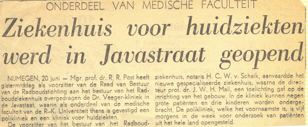 En dan is het zover…. Na meer dan 44 jaar onderzoek op de afdeling Dermatologie (Huidziekten) van het Radboudumc (Radboud Universitair Medisch Centrum) “mag je met pensioen”. Natuurlijk was er op 3 november een heel gezellige afscheidsreceptie en daarna een etentje met de directe collega’s. Nu, een paar weken later, is het tijd voor een eerste terugblik. Tijd voor een stukje geschiedenis van de afdeling Dermatologie en wel het begin op de Veegerkliniek aan de Javastraat, ver van het Radboudterrein.