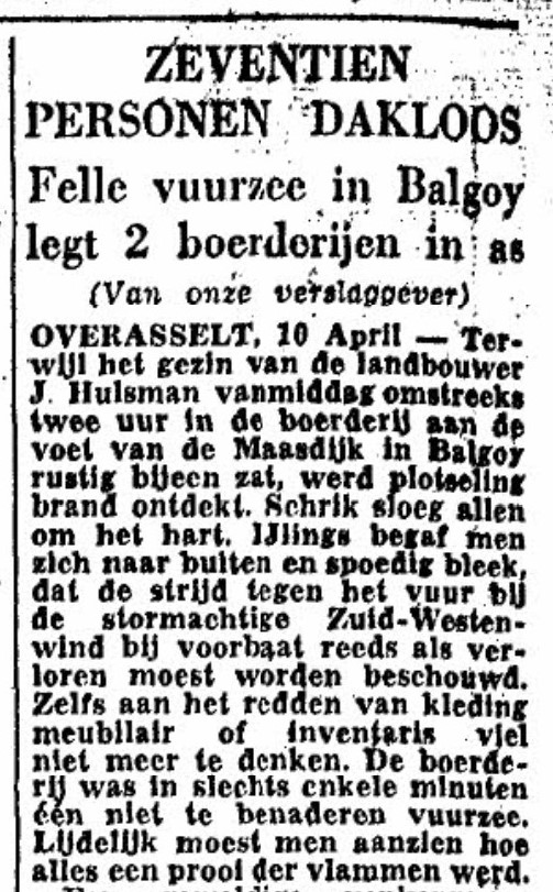 De dubbele brand die Roel noemt vond plaats op maandag 10 april 1950, Tweede Paasdag. De eerste brand brak uit in een boerderij op de hoek van de Maasbandijk en het Veerstraatje in Balgoy (kadastraal Nederasselt (NDA00), sectie C perceelnummer 165). In zeer korte tijd stond de boerderij van de gebroeders Hulsman (Piet, Koos en Jan) in vuur en vlam, mede door de sterke zuidwester storm. De ramp werd nog groter toen een tweede boerderij op zo’n 500 meter afstand, de boerderij van Hent Jansen aan de Eindsestraat, ook in brand vloog doordat de rieten kap vlam vatte door een vonkenregen. In de Gelderlander van 11 april 1950 staat geschreven dat door deze branden zeventien personen dakloos werden en bijna al hun bezittingen verloren gingen. Rikie, dochter van Jan Hulsman, vult nog aan dat die dag niet 17 maar 19 mensen dakloos werden en dat ze allemaal onderdak kregen in hun eigen dorp.
