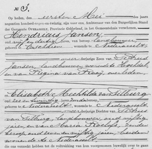 Burgerlijke Stand Overasselt, Huwelijken 1929. Uit deze akte blijkt dat Peter Jansen nog steeds in Duisland woont en dat zijn vrouw Regina van Raaij is overleden.
