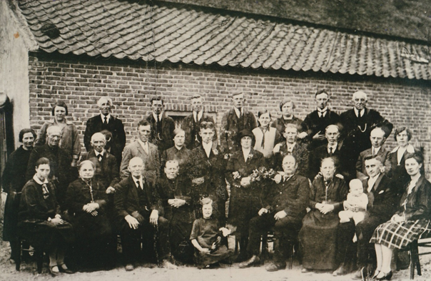 Familiefoto bij het huwelijk van Hent Jansen en Elisabeth van Tilburg. De foto is genomen bij het ouderlijke huis van Elisabeth van Tilburg aan de Eindsestraat in Nederasselt.
