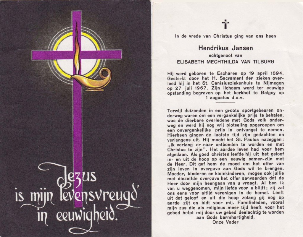 Hent Jansen overleed op 27 juli 1967 in het St. Canisiusziekenhuis te Nijmegen en ligt in Balgoy op het kerkhof begraven. In 1992 werd daar ook zijn vrouw Elisabeth van Tilburg begraven. Het huis werd in 1970 verkocht aan Adrianus Hoogstraten, tuinder uit Neerbosch en staat er nog steeds. Toen het huis verkocht werd woonde weduwe Elisabeth van Tilburg met haar twee dochters Regina en Wilhelmina er nog. De vijf andere kinderen waren allemaal uit huis volgens de gegevens van het kadaster.
