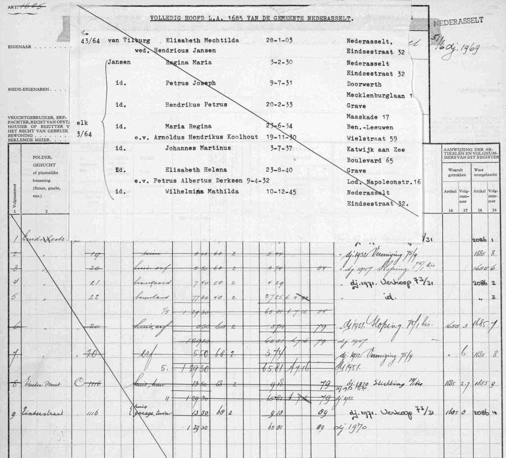 Hendrikus van Raaij heeft het huis aan de Eindsestraat in 1922 gekocht (kadastraal Nederasselt (NDA00), sectie C perceelnummer 20) en daarna verbouwd. Volgens het bevolkingsregister 1924-1931 woonde in dat huis (B101) toen ook Hendricus Jansen. Daarvoor woonde Hendrikus van Raaij in Nederasselt Dorp op nr 61 en 53 en tot 1900 in ieder geval zonder Hendricus Jansen, maar ik mis nog gegevens van het bevolkingsregister Overasselt tussen 1900 en 1924 (niet digitaal gevonden). Volgens de familie is Hendricus in 1919 op 25-jarige leeftijd teruggekomen naar Nederland en bij Hendrikus van Raaij in gaan wonen. In Nederasselt leerde hij Elisabeth van Tilburg kennen waarmee hij op 8 Mei 1929 trouwde in Balgoy. Op 1 mei werd al getrouwd voor de wet in Overasselt.