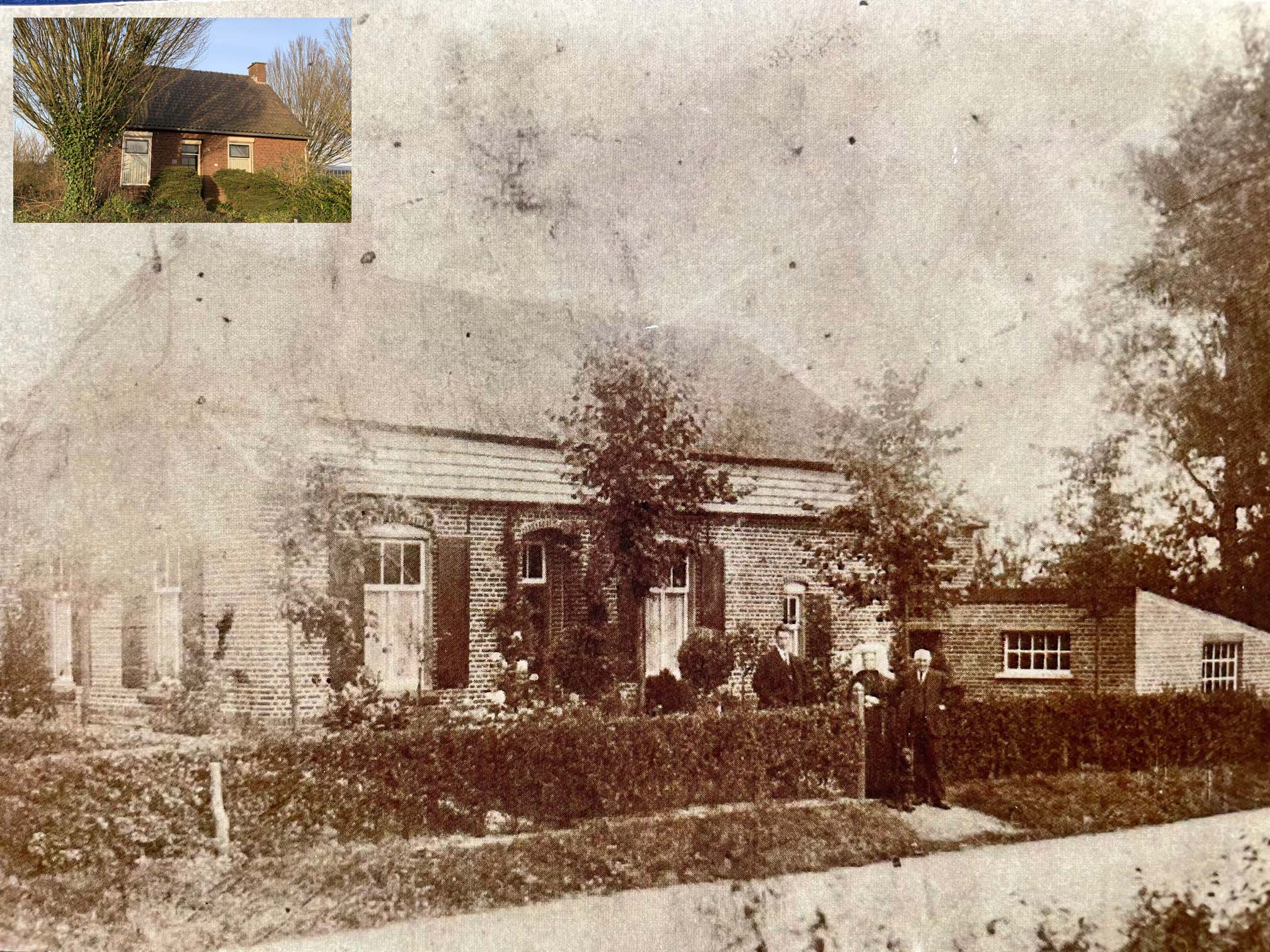 De boerderij aan de Eindsestraat waar Hent Jansen met zijn gezin gewoond hebben tot het in 1950 afbrandde. Deze foto is van eind jaren veertig (Bron: Piet Jansen, Oss). Linksboven de huidige situatie met het klein huisje dat werd gebouwd na de brand.