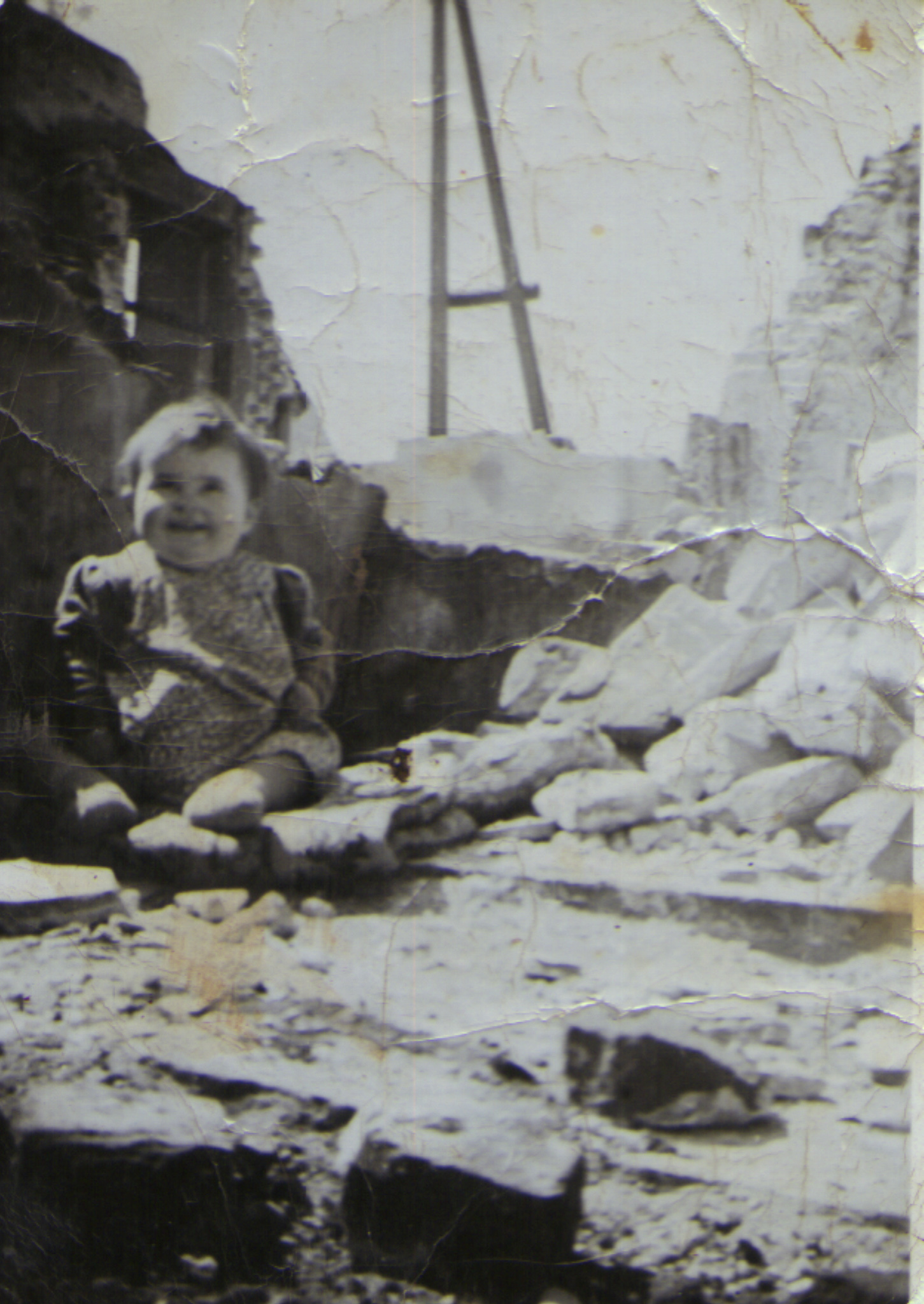 Restanten van het huis van de familie Hulsman aan de Maasbandijk. De foto met Rikie Hulsman is genomen in 1950 toen het huis op tweede paasdag afgebrand was en zij haar eerste verjaardag vierde bij Jan en Drieka Bours, hun buren van toen.