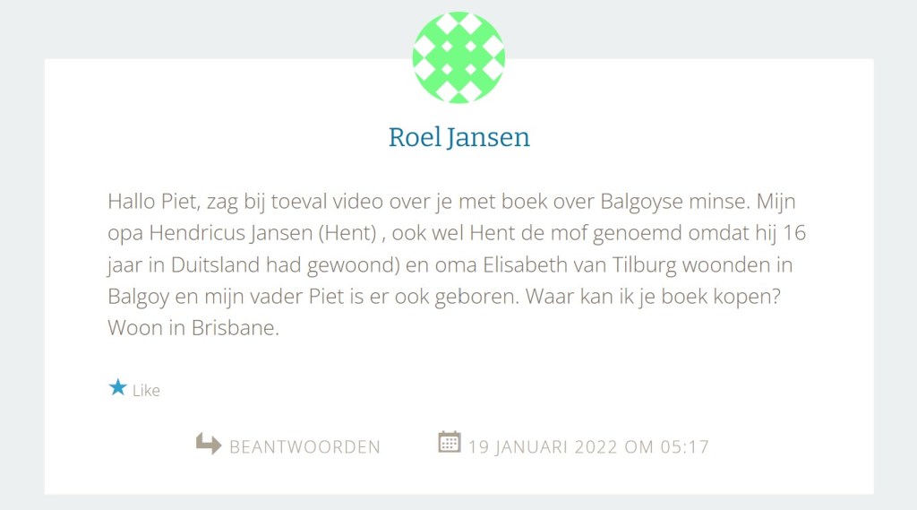 De tweede reden waarom ik het bericht interessant vond, was dat eind vorig jaar mijn vrouw Ans aangesproken werd in de kerk door mensen die ze in eerste instantie niet kende. De oudere man vertelde dat hij Piet Jansen heette en in Balgoy gewoond had. Na wat over en weer gepraat bleek deze man de broer te zijn van Harrie de mof. Ans kende Harrie ook, omdat ze zelf ook klarinet gespeeld heeft bij de harmonie. Uit het bericht hierboven blijkt dat de vader van Roel Jansen uit Brisbane Piet de mof is. De derde reden om wat dieper in de geschiedenis van de familie Jansen te duiken is de plek waar ze gewoond hebben in de Eindsestraat, een stukje Balgoy (eigenlijk Nederasselt) waar ik nog niet veel over heb verteld.