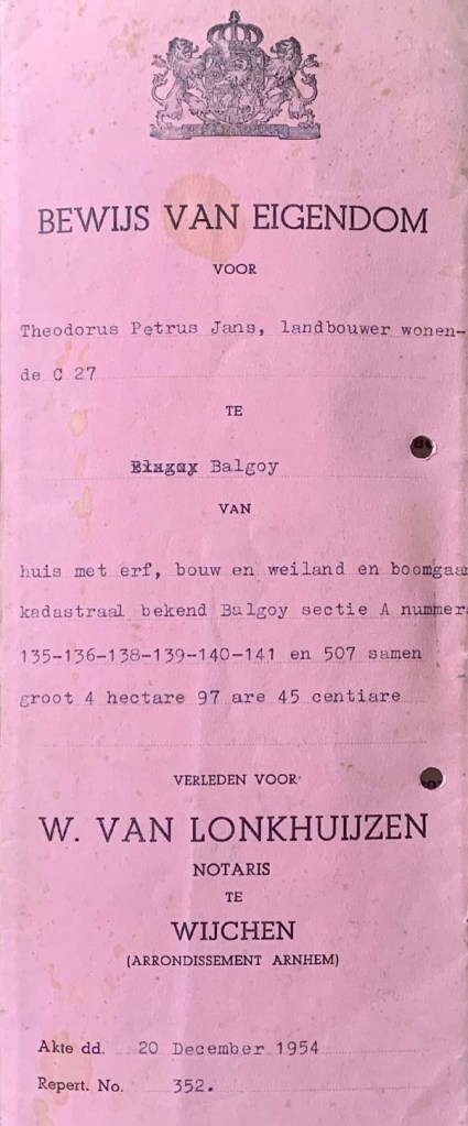 In november 1925 verandert alles. Op 27 november worden Fons en zijn zus uitgeschreven uit de gemeente Overasselt en vertrekken ze naar Nijmegen. Gradus Broeren moest daarom ook verhuizen en ging inwonen bij klompenmaker Nicolaas (Klaasje) van der Linden, die in het oude protestantse kerkje woonde (Wijk C 14 in Balgoy). De boerderij wordt verkocht via een veiling aan Gerardus (Grad) Hammen, geboren op 14 mei 1876 in Balgoy. Samen met zijn vrouw Kornelia (Keetje) Driessen (geb. Nederasselt, 1871) en hun drie kinderen – Franciscus Hendrikus, geb. 23 augustus 1908 in Balgoy, Regina Elisabeth, geb. 18 juni 1910 in Balgoy en Hendrikus Franciscus, geb. 16 januari 1912 in Balgoy – woonde hij tot dan toe aan de Houtsestraat, in de Holtschehoek (Frans Hammen, een boerenknecht uit Reek trouwt in de 19e eeuw in Balgoy. | Piet’s Blog: Balgoyse mins).