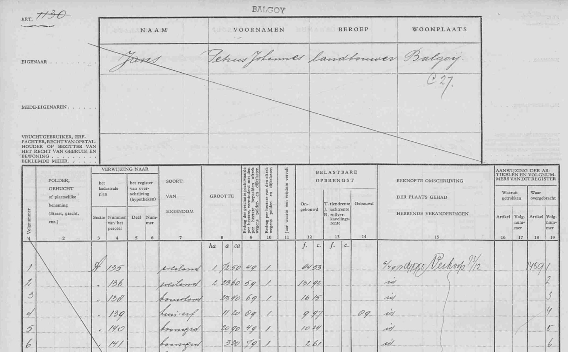 De oudst bekende eigenaar van deze boerderij is Francis Jacobs, die vóór 1811 op deze plek woonde. Rond 1825 werd het eigendom van Jan van Eldonk, geboren rond 1794 en afkomstig uit Keent. In 1826 woonde hij met zijn vrouw Elisabeth Jacobs in Balgoy toen hun zoon Franciscus werd geboren. Het perceel is terug te vinden in het minuutplan van Balgoy (sectie A nummer 129) en wordt in de OAT (Oorspronkelijk Aanwijzende Tafel) beschreven op blad 008.