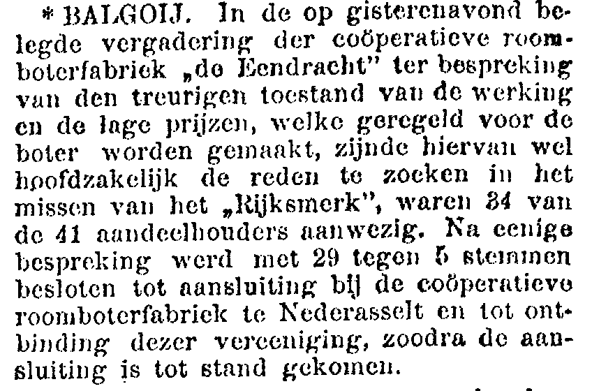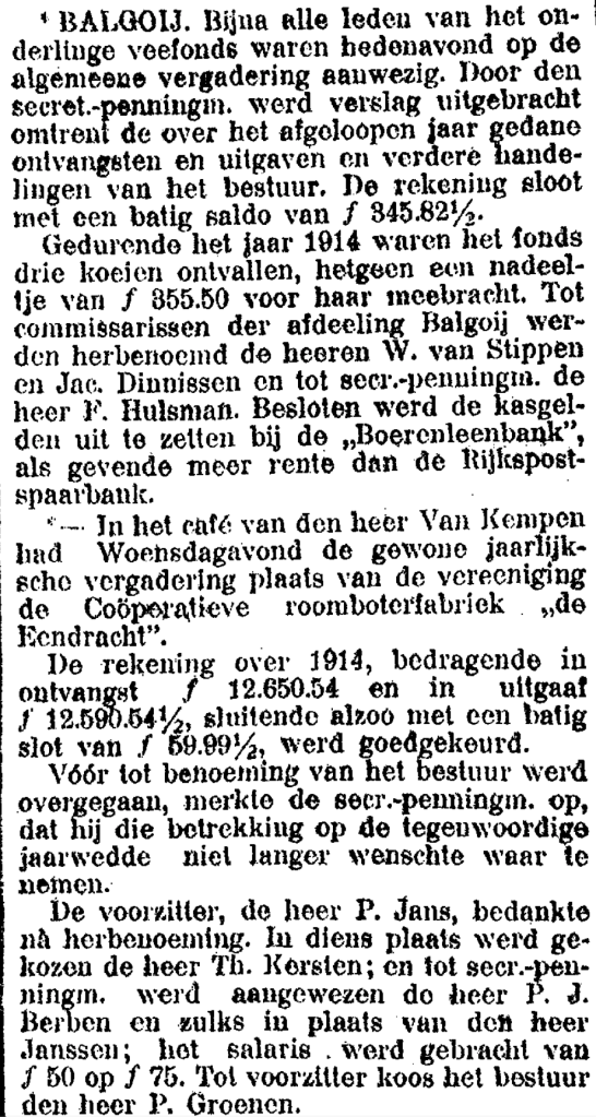 Met de opbloei van de landbouw zag je ook de coöperatieve gedachte in Nederland opbloeien. De Boerenbond werd opgericht vanaf het einde van de 19e eeuw (Balgoy in 1912; boek 100 jaar NCB – Veel gewonnen, veel verloren, de ploeg bouwt steeds weer nieuwe voren – auteur: Ries van Haren). De oprichting van collectieve veeverzekeringen, ook die in Balgoy, waren van grote betekenis voor de boeren evenals de Coöperatieve Boerenleenbank, die een concurrent werd van de Rijkspostspaarbank. Dit alles wordt mooi geïllustreerd in een krantenartikel uit de Gelderlander van 17 januari 1915. Hierin wordt verslag gedaan van de ledenvergaderingen van het Balgoyse veefonds en de coöperatieve roomboterfabriek, die de activiteiten over het jaar 1914 bespraken.