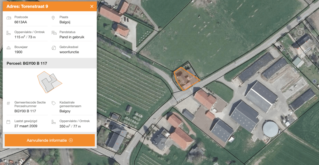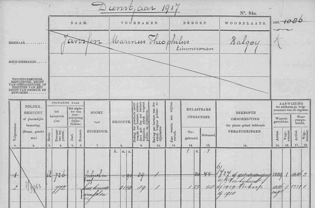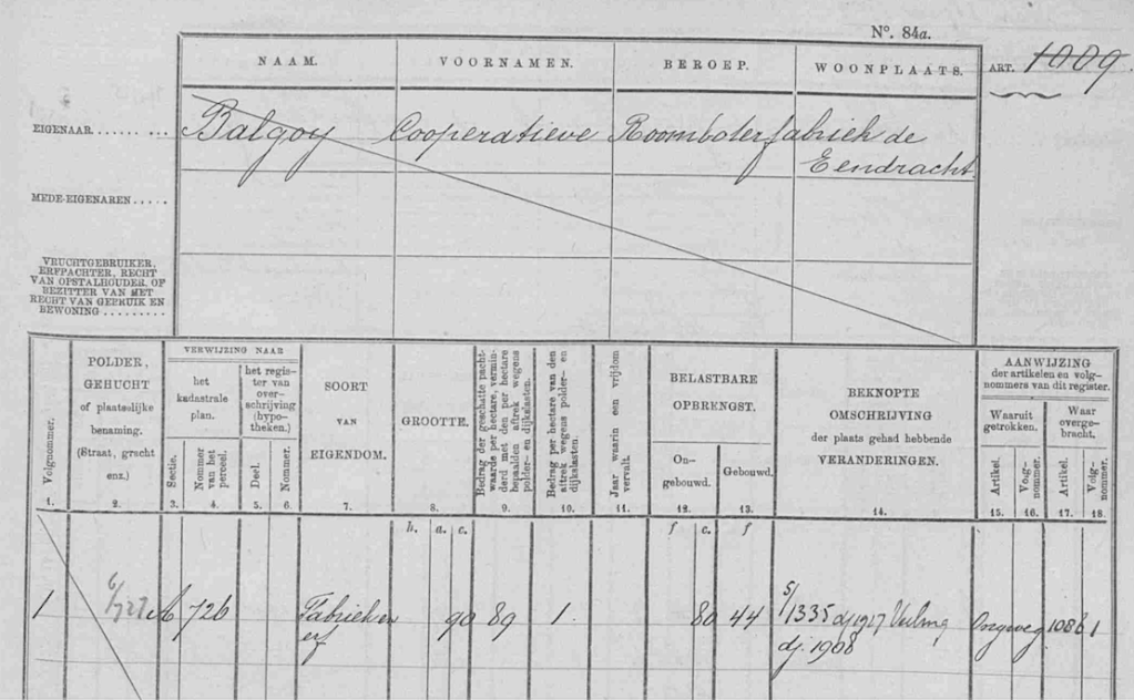De oudst bekende kadastrale gegevens voor het perceel dateren van eind 19e eeuw: BGY00 leggerartikel 458: eigendom Joannes de Bruijn, burgemeester van Balgoy. Het betreft sectie A, nr. 336, volgnr. 16. De omschrijving van het perceel was bouwland. Het perceel gaat dan over naar artikel 889 volgnr. 3. op naam van Elisabeth de Bruijn, particulier. In dienstjaar 1906 wordt het perceel (nog steeds bouwland) verkocht aan Johanna Arts, weduwe van Johannes Wilhelmus Berben, en gaat over naar artikel 950 volgnr. 6. In die periode werd volgens de website www.zuivelfabrieken.nl in Balgoy een handkrachtfabriekje gestart, de coöperatieve roomboterfabriek “de Eendracht”, maar een link van de nieuwe boterfabriek naar het betreffende perceel kwam vooralsnog niet naar boven in het kadastrale register.