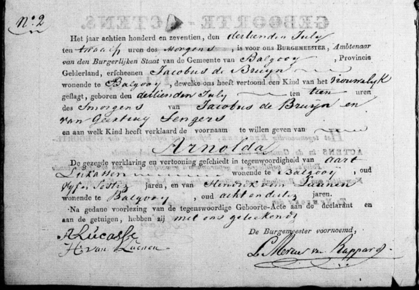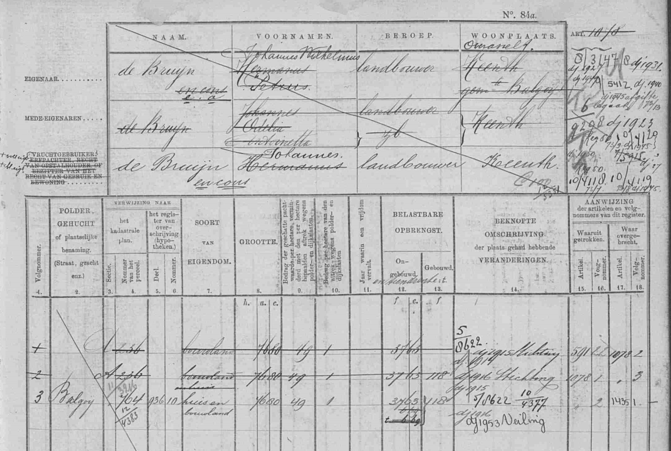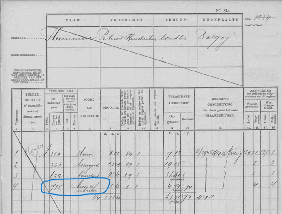 De oudst bekende eigenaar van deze boerderij is Francis Jacobs, die vóór 1811 op deze plek woonde. Rond 1825 werd het eigendom van Jan van Eldonk, geboren rond 1794 en afkomstig uit Keent. In 1826 woonde hij met zijn vrouw Elisabeth Jacobs in Balgoy toen hun zoon Franciscus werd geboren. Het perceel is terug te vinden in het minuutplan van Balgoy (sectie A nummer 129) en wordt in de OAT (Oorspronkelijk Aanwijzende Tafel) beschreven op blad 008.