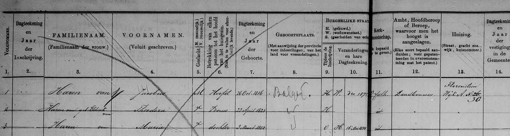 Na Elisabeth van Florenstein Paulussen en Petrus Jacobs van Haren, woont zoon Frans (Franciscus) met echtgenote Maria Geerds op Florenstein. Zij krijgen acht kinderen, waarvan Jacobus (Jacob) van Haren, die in 1851 met Theodora van Eldonk trouwt, op Florenstein blijft wonen (Zie bevolkingsregister hierboven). In het kadaster, dat in de eerste helft van de negentiende eeuw wordt ingevoerd, is Florenstein te vinden in Balgoy, sectie A nummer 142 en staat het op naam van de erven Jacob(s) van Haren, landbouwer te Balgoij (2190 m2 huis en erf). Jacobus van Haren en Theodora van Eldonk krijgen tenminste zes kinderen. Het oudste kind, dochter Maria, wordt op 3 maart 1852 geboren. Zij trouwt in 1874 met Peter Gerrit de Bruijn en het echtpaar gaat daarna in Nederasselt wonen (zie bevolkingsregister 1860 – 1890, blad 19). In 1875 overlijdt Theodora van Eldonk en in 1880 komen Peter Gerrit de Bruijn en Maria inwonen bij Jacobus in Balgoy (zie bevolkingsregister 1890-1923, blad 23). In 1890 overlijdt Maria; ze is dan pas 38 jaar.