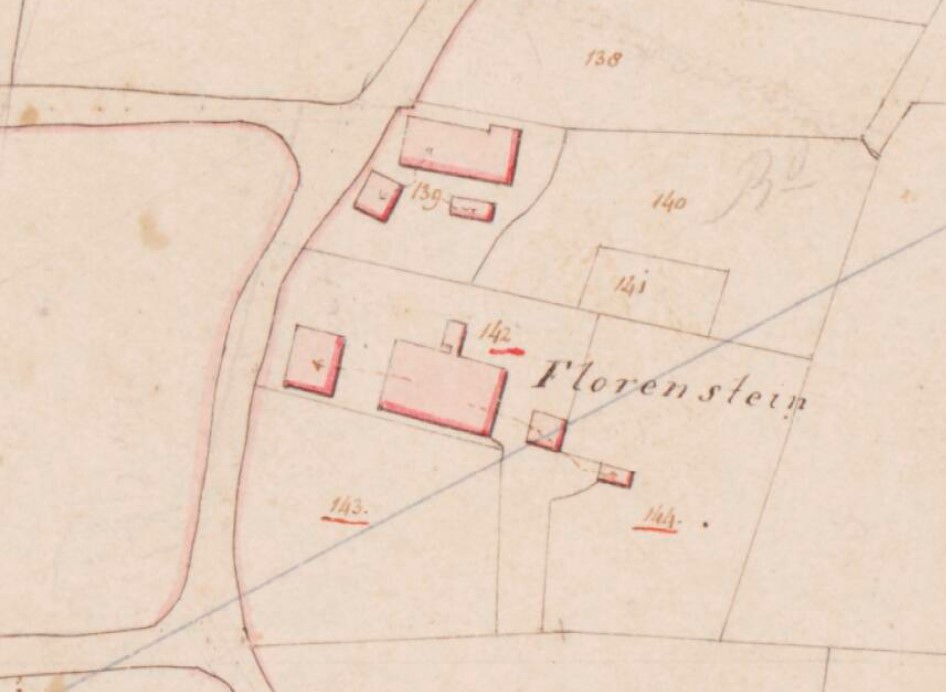 Na het verhaal van Hans Eerdmans en de sage van Gomarrius Mes in de vorige blog, heb ik geprobeerd in dit artikel de geschiedenis van Florenstein te reproduceren. Recentelijk vond ik een oud gedigitaliseerd boek uit 1886 getiteld “De Navorscher” deel 36. Op bladzijde 499-500 staat een stukje geschreven over een voormalig adellijk huis Florensteijn (Florenstein) in Balgoy, dat op het moment van schrijven al een boerderij was. Er staat ook geschreven dat het adellijk huis niet moet worden verward met het huis te Balgooi, de plek waar vroeger een kasteel gestaan heeft. Op bovenstaande foto, een detail van een kadastrale kaart uit 1811-1832, zie je een boerderij met de naam Florenstein. We kennen allemaal de plek van deze boerderij, omdat die nog steeds prominent in Balgoy te vinden is. De naam Florensteijn prijkt nog op de voorgevel. Het adellijk huis Florenstein komt al voor in het verpondingskohier van de heerlijkheid Balgoy, opgemaakt 21 juni 1650, en is dan in het bezit van Jhr. Bartholomeus van Golstein. Deze verpachtte het huis aan Henrick Dircks. In 1660 behoorde het huis aan Ludolph van Steenhuys, heer van Oploo, Florenstein enzovoort en diens vrouw Anna van Randwyck. In 1677 komt het huis bij de boedelscheiding aan hun zoon Walraven van Steenhuys, die heer van Heumen, Malden, Oploo en Florenstein wordt. Na diens dood vererft het huis op zijn dochter Genoveva Maria, die is gehuwd met Bernard baron van Welderen. Deze zal het huis verkocht hebben aan de Balgoyse schepen Paulus Ardt Artz, die zich Artz van Florenstein laat noemen. Paulus Artz van Florenstein trouwt in 1726 met Jacomina (Willemina) Ardts Herberts en zij krijgen tenminste negen kinderen. Een van hun dochters, Elisabeth van Florenstein Paulussen, geboren op 23 mei 1738 en in 1759 getrouwd met Petrus Jacobs van Haren, kreeg in 1783 Florenstein uit haar vaders goederen.