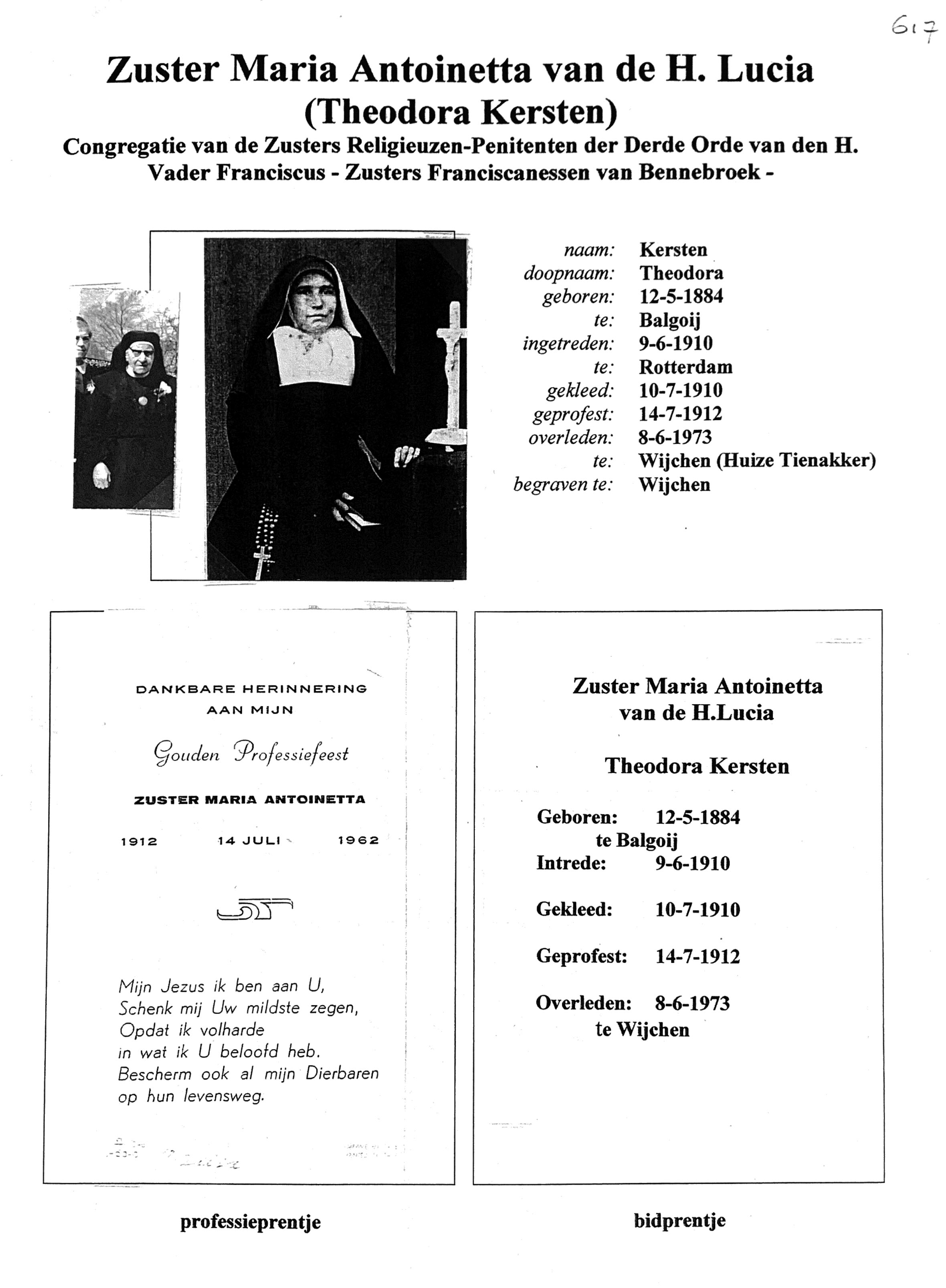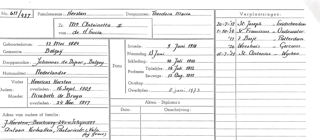 Op 6 december van datzelfde jaar krijgen Joannes en Gijsberta weer een zoon, die ze dezelfde naam geven als hun in januari overleden zoon, Antonius Gijsbertus Hermanus. Als Antonius 19 jaar oud is op 3 oktober 1895, treedt hij in de orde der Minderbroeders-Capucijnen in Babberich en een jaar later wordt hij geprofest. In 1902 wordt hij priester gewijd (zie het herinneringsprentje). “Na meermalen de bediening van Novicenmeester, Definitor en Gardiaan vervuld te hebben, voorzien van de H. H. Sacramenten der stervenden”, is Antonius overleden te Handel op 5 maart 1948.