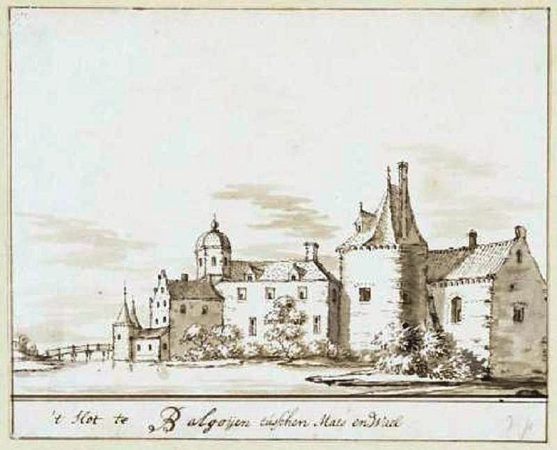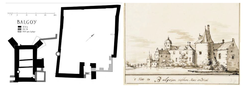 De meanderende Maas heeft eeuwenlang het lot bepaald van het gebied waar nu Balgoy en Keent liggen. Het dorp Balgoy is heel waarschijnlijk ontstaan op een wat hoger gelegen zandgebied ten westen van Nederasselt, waar de rivier gedwongen werd een ruime bocht naar het noordwesten te maken (loop I in figuur 1). Balgoy lag toen westelijk van de rivier, op Brabantse grond. Toen de rivier in de 11e eeuw van bedding veranderde (loop II in figuur 1, loop III is de huidige situatie) kwam Balgoy aan de noordelijke (Gelderse) kant van de Maas te liggen. In die tijd zullen door de veranderde ligging Balgoy en Keent meer met elkaar te maken gekregen hebben. De kerken, met name het bisdom Utrecht, maar ook het dekenaat Xanten, behorend tot het aartsbisdom Keulen, spelen dan een belangrijke bestuurlijke rol. We weten dat in de 12e eeuw de buurschappen Balgoy en Keent werden ondergebracht in één kerspel. In Balgoy was al lang daarvoor een kerkje gebouwd (ca. 960) en in Keent een kapel. De bisschoppen van Utrecht verwierven veel grond in het gebied en zij inden de tienden (belastingen) in Balgoy voor het Kapittel van St. Jan. Zij bouwden er ook een grote herenboerderij of vroonhoeve. Horigen deden het werk en het bestuur van Balgoy werd geregeld vanuit deze vroonhoeve, die waarschijnlijk gestaan moet hebben in de Holtsehoek (in de buurt van de boerderijen ’t Hof en/of ’t Hold). Een vroonhof, vroonhoeve of vroenhof was in de middeleeuwen de hoeve, van waaruit de omringende landbouwgronden werden geëxploiteerd volgens het puur economische Hofstelsel, dus voordat er in Balgoy sprake was van een meer feodaal, politiek systeem, de Heerlijkheid. Wanneer die herenboerderij definitief verdween, is nog niet duidelijk. Het kerkje in Balgoy bleek al snel te klein, want al in diezelfde 12de eeuw werd het vergroot. De kanunniken van het Kapittel van St. Jan, die de gronden in bezit kregen en exploiteerden, gaven de kerk de naam St. Jan. Johannes de Doper was hun beschermheilige.