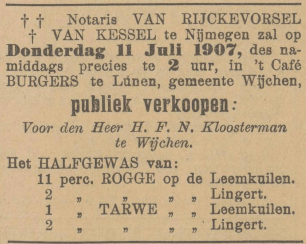 Ik was wel benieuwd waarom deze buurt de naam “de Lingert” heeft gekregen. Het enige wat ik tot nu toe gevonden heb is een advertentie uit 1907 in de Provinciale Geldersche en Nijmeegse Courant, waarin vermeld wordt dat in cafe Burgers te Lunen onder andere het halfgewas van twee percelen rogge en twee percelen tarwe publiek is verkocht. Het betrof percelen op de Lingert. Dit suggereert dat de Lingert agrarische grond was in deze buurt. Een leuke bijkomstigheid is, dat ik nu net als de Alvernezen, die op Alverna wonen, kan zeggen dat ik op de Lingert woon.