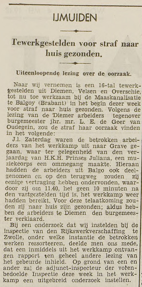 Als je de kranten moet geloven, was iedereen zeer positief over de inzet van de tewerkgestelden bij de maaswerken. Het hele project is redelijk binnen de planning afgerond en er zijn nauwelijks problemen geweest met de werkers. In de regionale kranten, zoals de Gelderlander of de Provinciale Geldersche en Nijmeegsche Courant, ben ik geen incidenten tegengekomen. Na wat zoeken kwam ik wel een bericht tegen in de IJmuider Courant van 4 mei 1938. Het betrof een probleempje van een groepje tewerkgestelden van het werkkamp die werkzaam waren bij de maaskanalisatie te Balgoy (Brabant!). Zij waren gaan stappen in Grave en te laat binnengekomen (althans dat was de versie van de werkers). Zij werden voor straf naar huis gestuurd. Alleen stond in het rapport een heel andere lezeing over de reden waarom ze naar huis waren gestuurd.