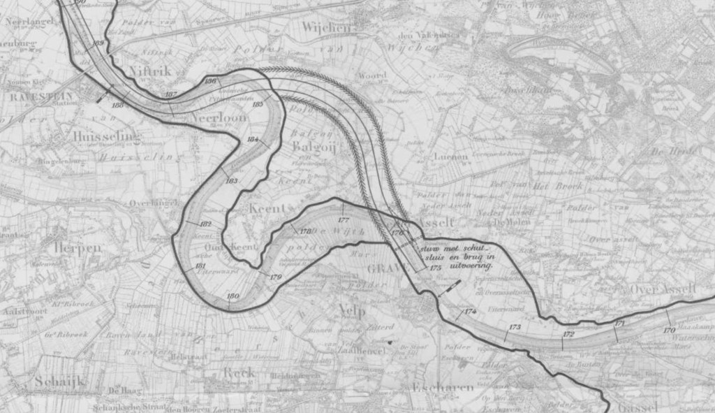 In het voorontwerp van Lely is de bochtafsnijding ten noorden van Balgoy getekend, zoals in deze tekening uit de Gelderlander van 24 februari 1938 duidelijk te zien is (vergissing van de Gelderlander?).