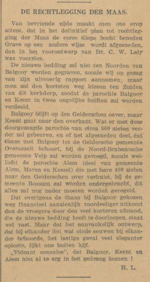 Dat de maaskanalisatie in Balgoy voornamelijk gedurende de jaren dertig van de vorige eeuw is gerealiseerd, is daarom niet verwonderlijk. Mede vanwege de goedkope arbeidskrachten door de crisisjaren (tewerkgestelden) en de angst voor herhaling van een dijkdoorbraak zoals in 1926, kon ingenieur Lely zijn plannen versneld uitvoeren. In juli van datzelfde jaar 1926 kwam Lely al met o.a. de aanbeveling dat tussen Grave en Blauwe Sluis tien scherpe bochten moesten worden afgesneden waardoor de rivier met 19 kilometer zou worden ingekort, hierbij ook de bocht bij Balgoy en Keent en bij Neerloon. Hierdoor zou de waterafvoer worden bevorderd. De ingekorte rivier was bovendien een extra voordeel voor de intensievere vrachtscheepvaart.