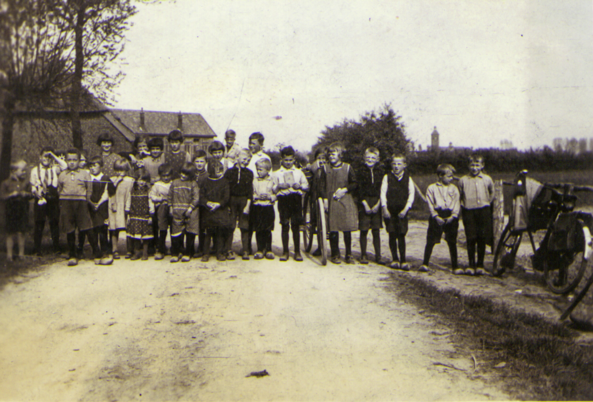 Van de werkzaamheden herinner ik me verder, dat er dagelijks rijen fietsers bij ons langs kwamen, die in het kader van de werkverschaffing met de schop kiepkarretjes moesten gaan vullen met klei. Die karretjes liepen op rails, die dwars over de weg lagen bij Chris van Rossum. Op een zondag ging ik daar, met mijn zusje achterop, spelen (we hadden stiekem de fiets van moeder gepakt) en we zijn uitgegleden over die rails. Vies dat we waren, vol klei. Gelukkig kwam Oom Grad uit Keent net op visite, zodat het niet opviel toen we zo thuis kwamen.