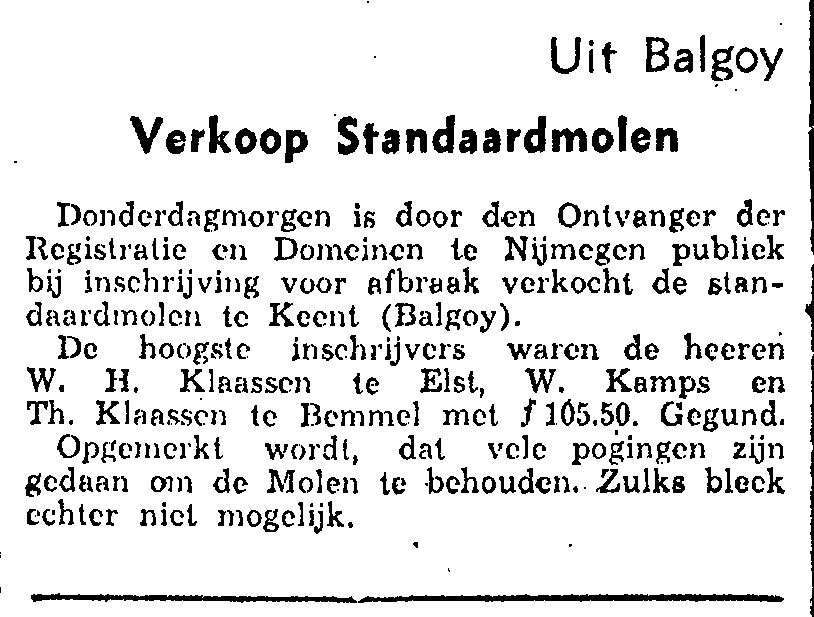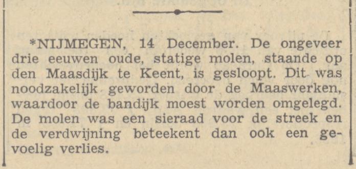 Mijn nichtje Nellie Toenders (wegens hertrouwen van moeder later Nellie Poos genoemd) was al in 1935 verhuisd naar Alphen, omdat hun woning precies op de nieuwe dijk zou komen te staan. Chris van Rossum (de bakker) is vertrokken naar Lunen, want zijn huis stond anders midden in de Maas. Piet de Bruin moest ook weg: die woonde op de plek, waar de pont kwam. Ook mensen, die niet weg hoefden, werden uitgekocht. Veel mensen kwamen in noodwoningen. Heel Keent kwam in het bezit van de domeinen. Slechte pachters kregen geen nieuw contract. Wij moesten er bijvoorbeeld voor zorgen, dat er geen distels stonden en zulke dingen.