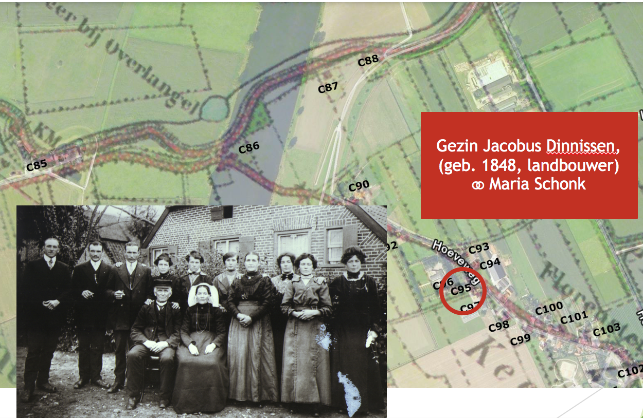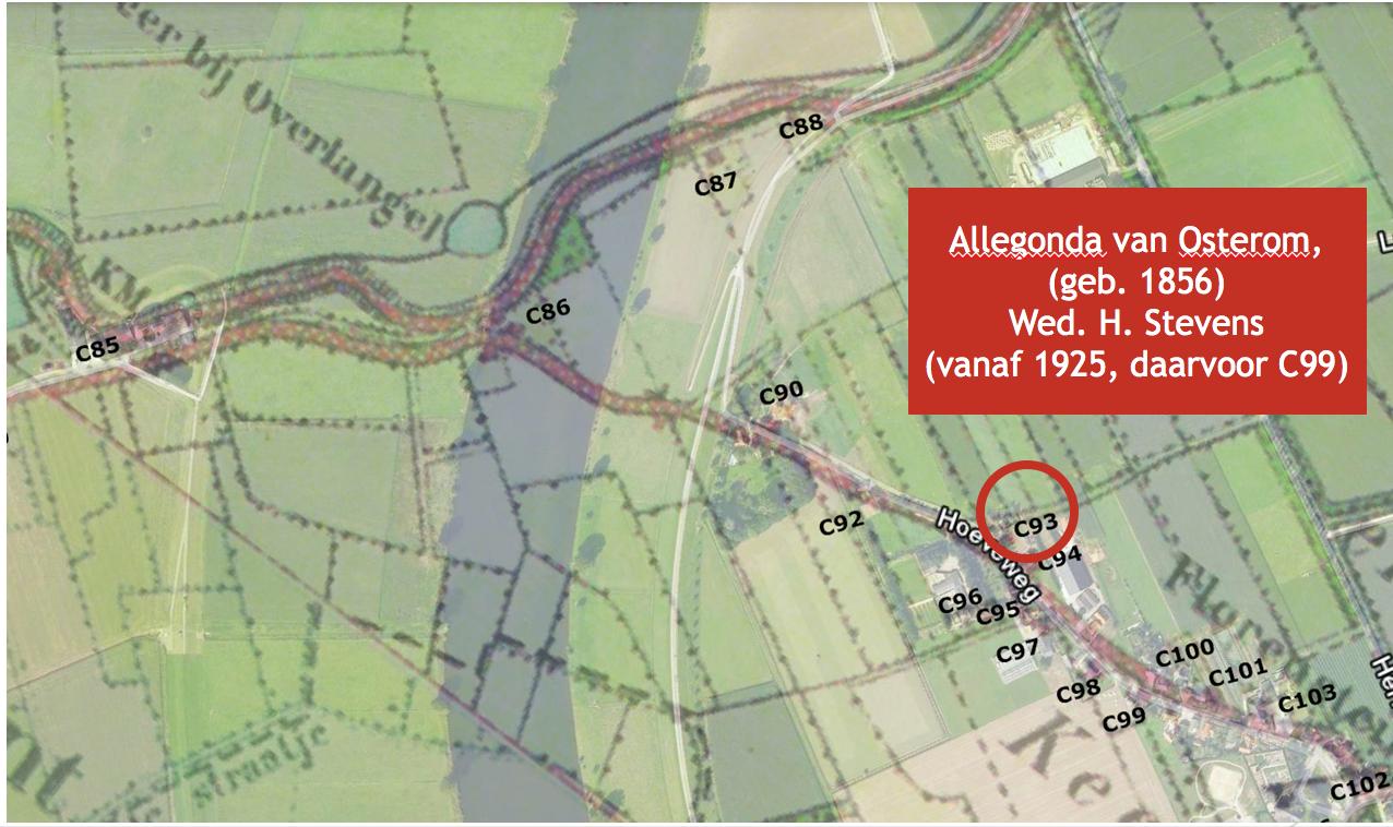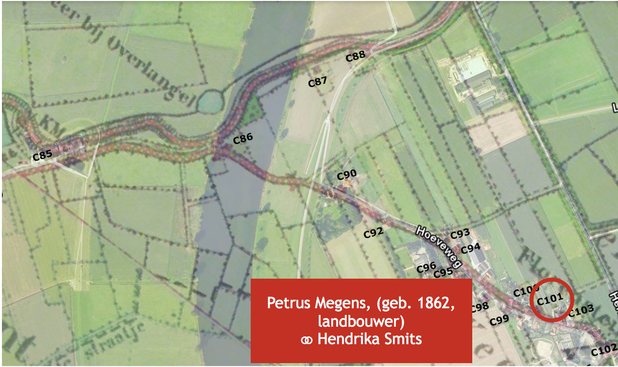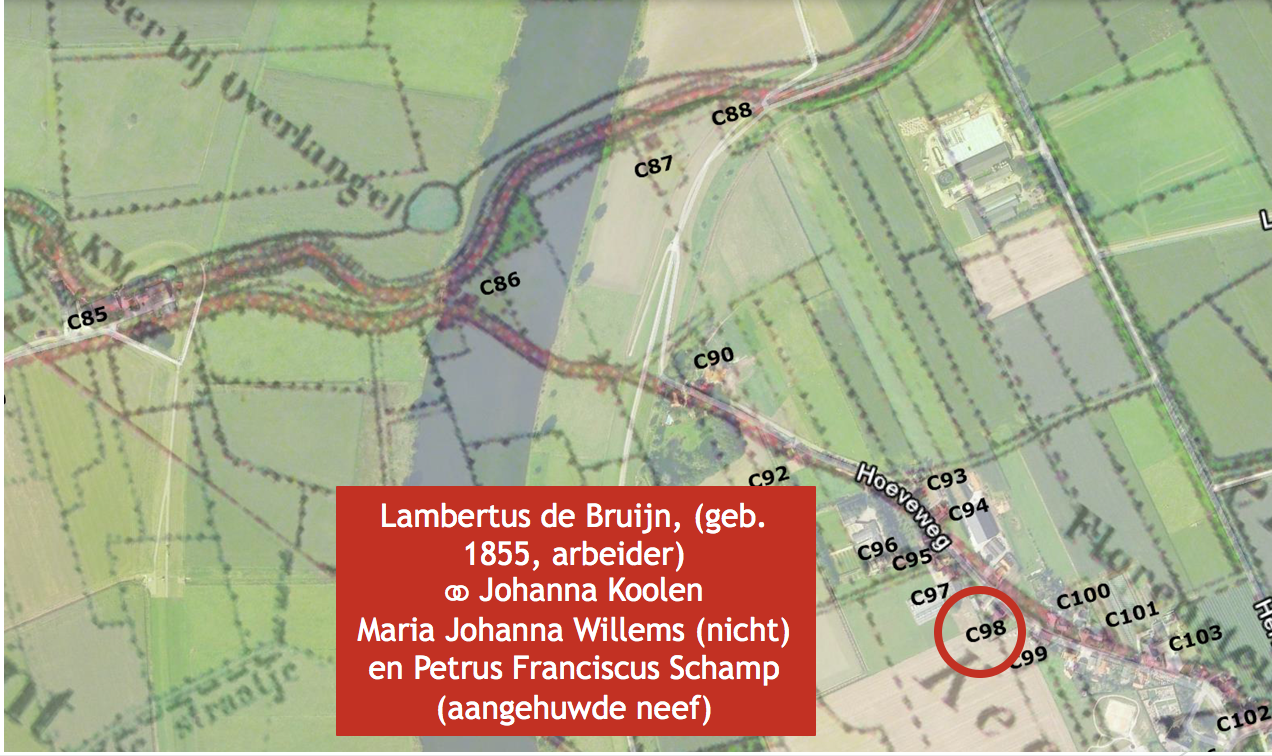 Wie woonde er nog meer in de Hoeveweg in die tijd (6)? Misschien ook wel een interessante vraag voor de vele nieuwe bewoners van de straat. Een stukje geschiedenis van de plek waar je woont willen de meeste mensen wel weten. Hiervoor werd het bevolkingsregister van de gemeente Overasselt periode (1924 – 1931) in het Regionaal Archief te Nijmegen geraadpleegd. Het bevolkingsregister bestaat uit 10-jarige tabellen met daarin de inwoners van de gemeente geregistreerd op huisnummer. Bovendien is opgetekend wanneer zij in de betreffende periode zijn gevestigd of wanneer zij zijn vertrokken. De onlogische begindatum (1924) wordt verklaard door het feit dat op 1 mei 1923 de gemeente Balgoy en Keent haar zelfstandigheid opgaf en werd gevoegd bij de gemeente Overasselt. Als huisnummer is de nummering aangehouden zoals die door de gemeente Overasselt werd ingevoerd in de zomer van 1928 (juli/augustus). De huisnummers zijn ingetekend op een landkaart van die periode. Deze kaart is weer als overlay gebruikt op een Google Earth luchtfoto met datering 2006.