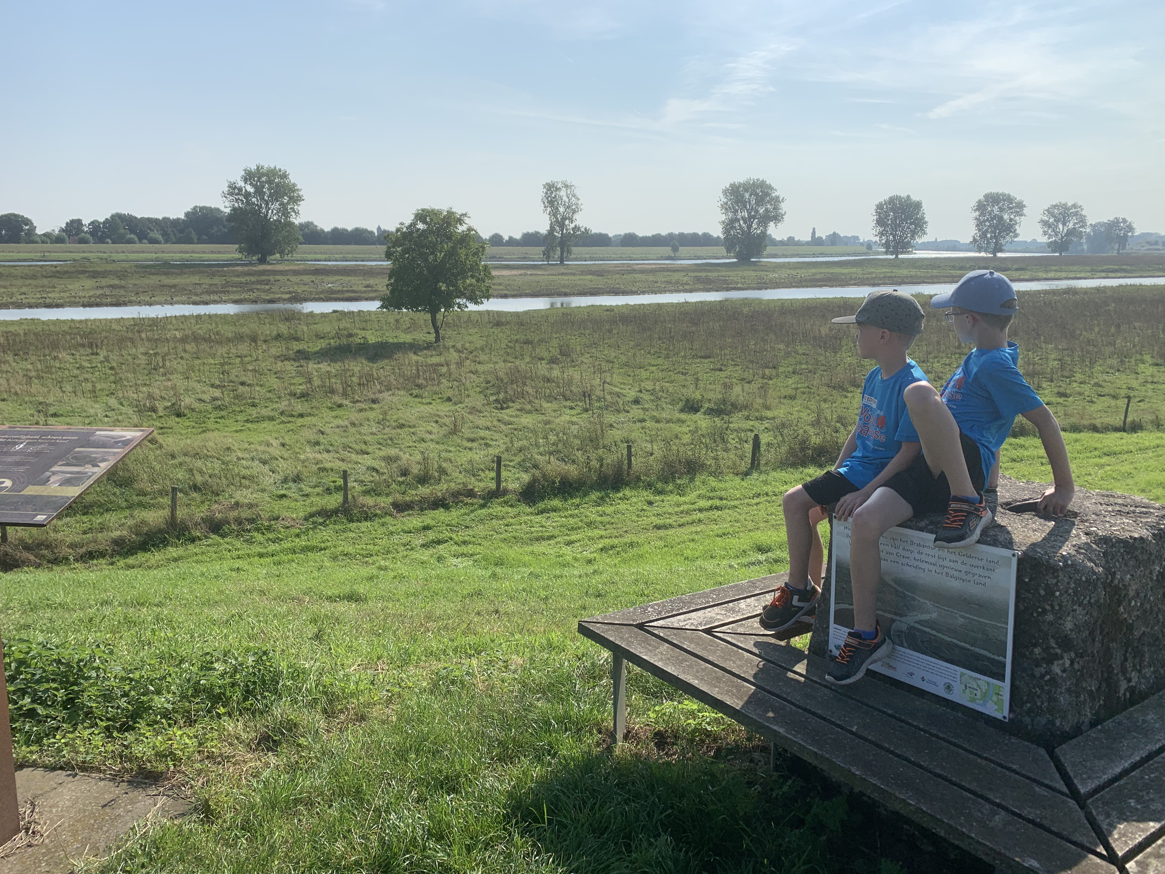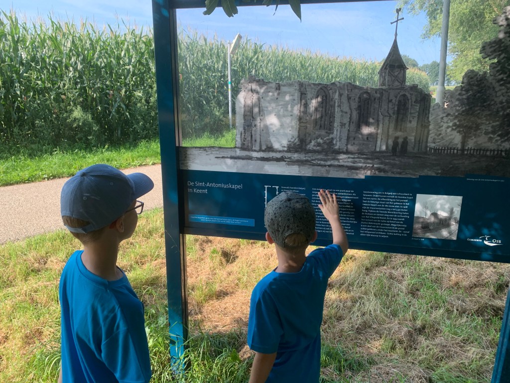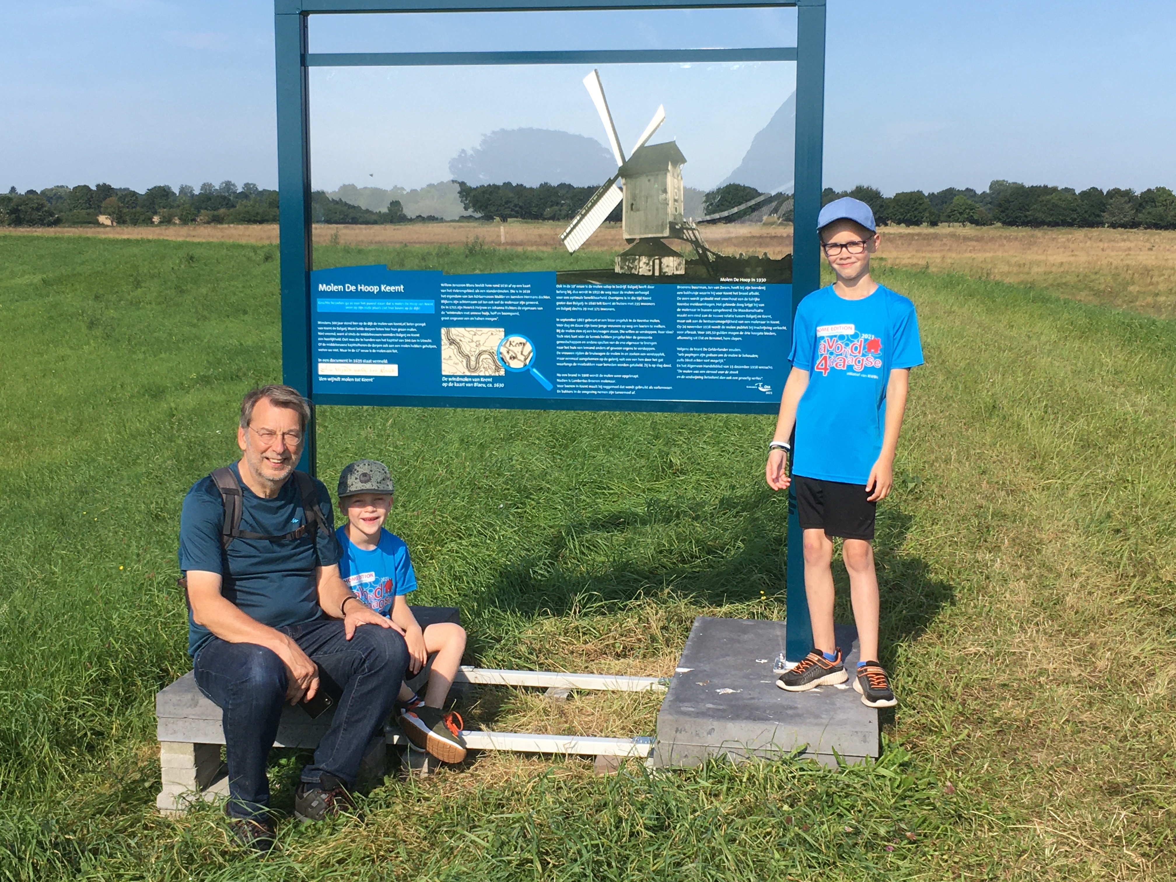 De titel van deze blog zijn woorden van mijn 6 jarige kleinzoon Casper toen ik zei dat ik wel een verhaaltje schrijven wilde over onze wandeling door Keent. Het was vandaag 12 augustus dat Thomas en Casper de derde etappe liepen, samen met opa en oma, van de avond4daagse 2021. Na Wijchen en Grave was nu Keent aan de beurt (de laatste dag is gereserveerd voor Balgoy). Ik mocht het doel van de derde dag kiezen en had uitgelegd dat vroeger Balgoy en Keent bij elkaar hoorden en samen een gemeente waren. Verder had ik verteld dat er in Keent een molen had gestaan en dat die er was geweest voor de Keentse en Balgoyse mensen. Toen de Maas eind jaren dertig van de vorige eeuw werd gekanaliseerd en precies tussen Balgoy en Keent kwam te liggen, betekende dat het einde van de molen. Op 6 augustus werd een nieuw informatiebord onthuld en dat wilde ik graag zien.