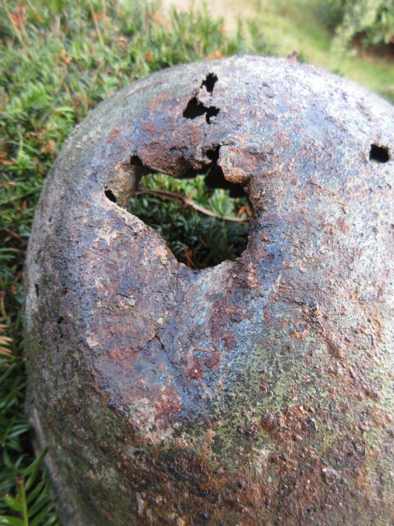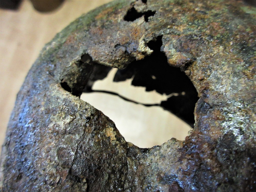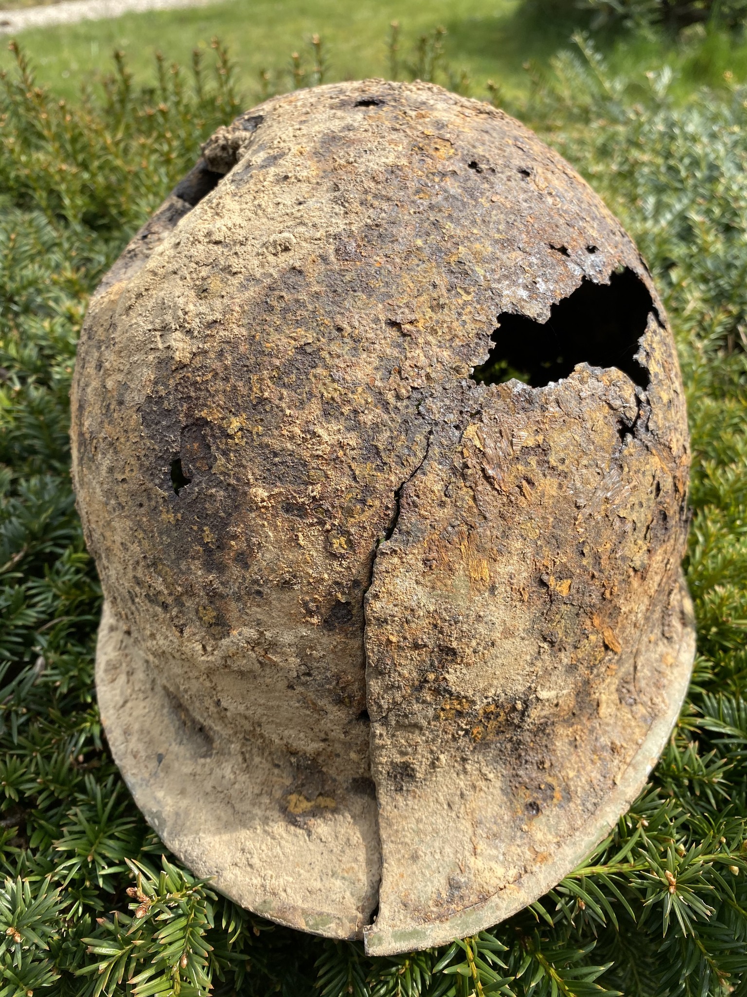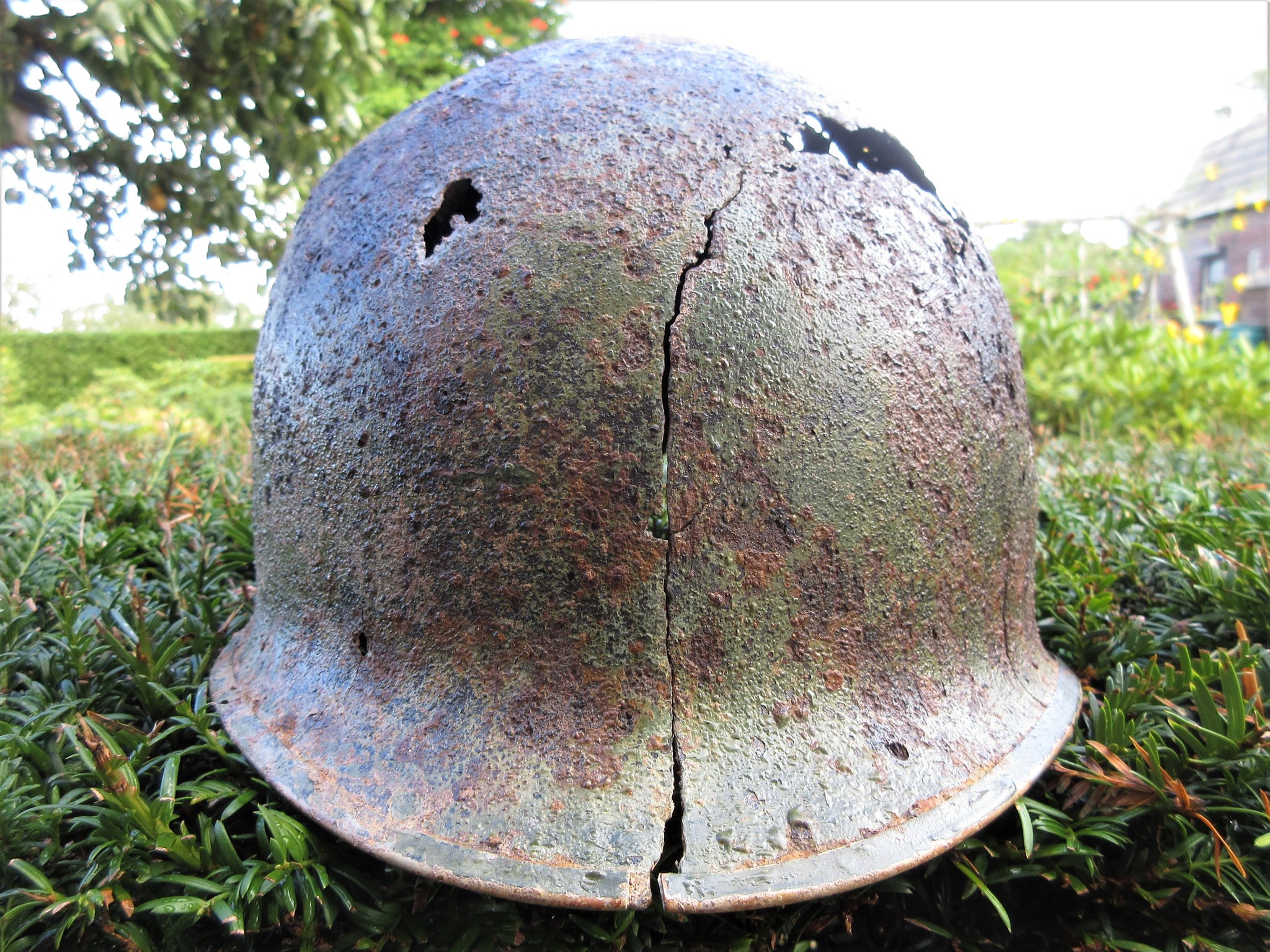De scherf is rechtsboven ingeslagen en heeft aan de achterzijde de rand versplinterd. Het is te hopen dat een soldaat de helm toen niet op had want dit is niet te overleven lijkt me.