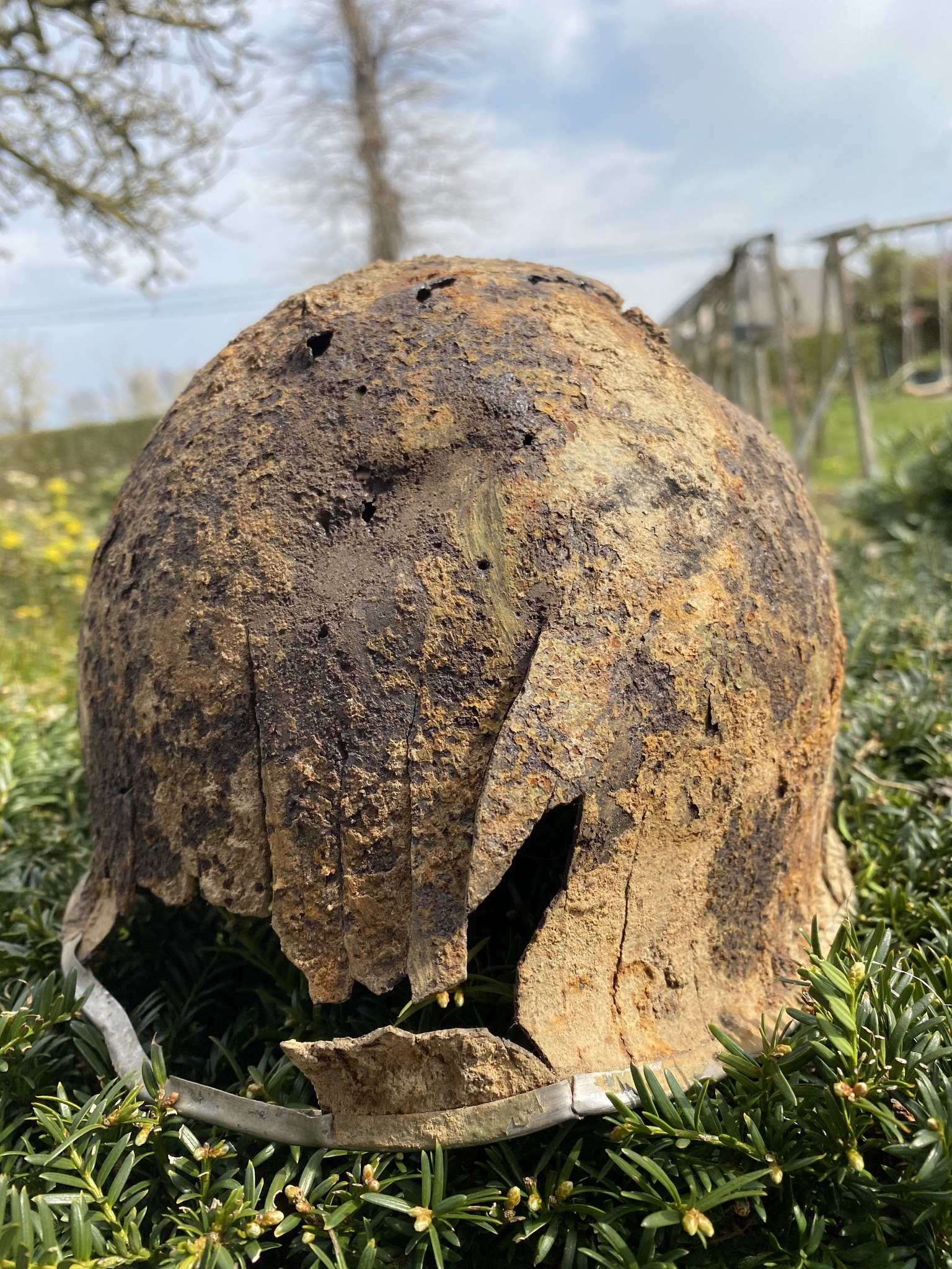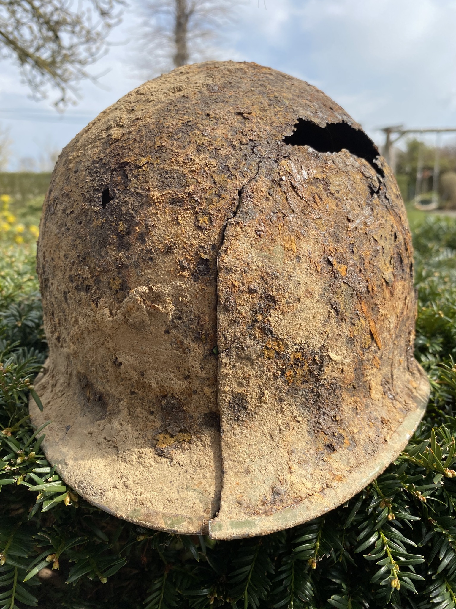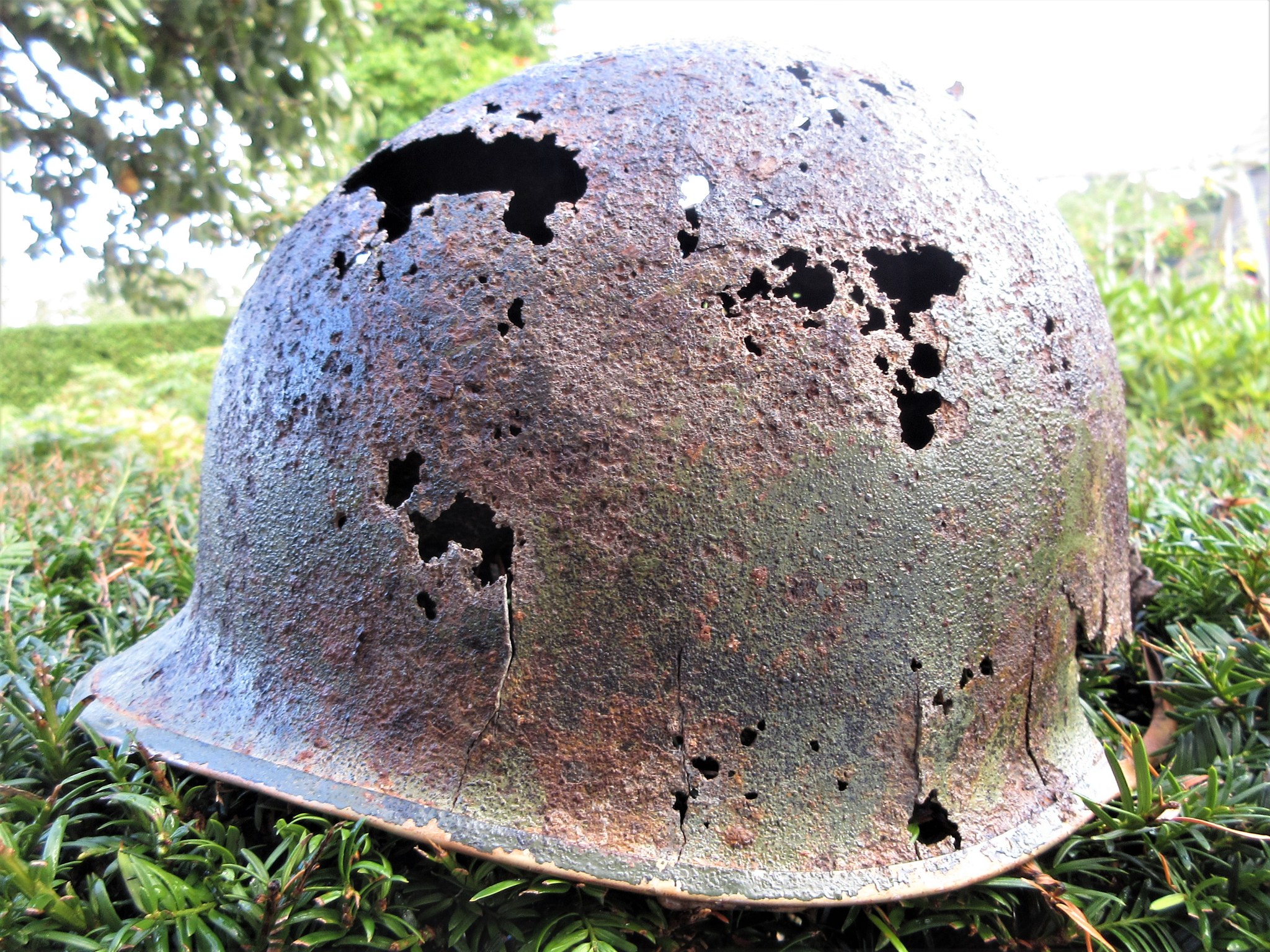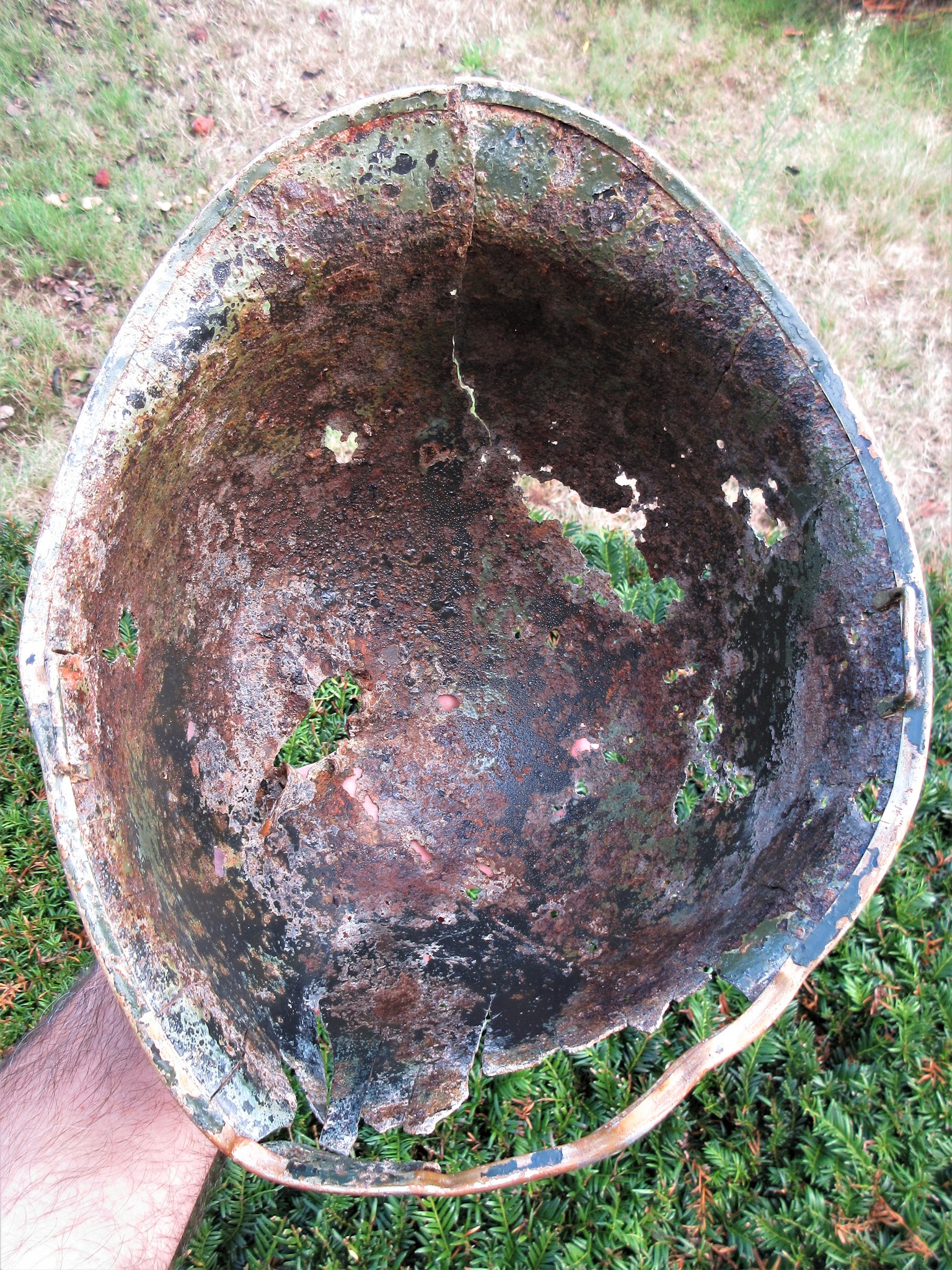 De scherf is rechtsboven ingeslagen en heeft aan de achterzijde de rand versplinterd. Het is te hopen dat een soldaat de helm toen niet op had want dit is niet te overleven lijkt me.