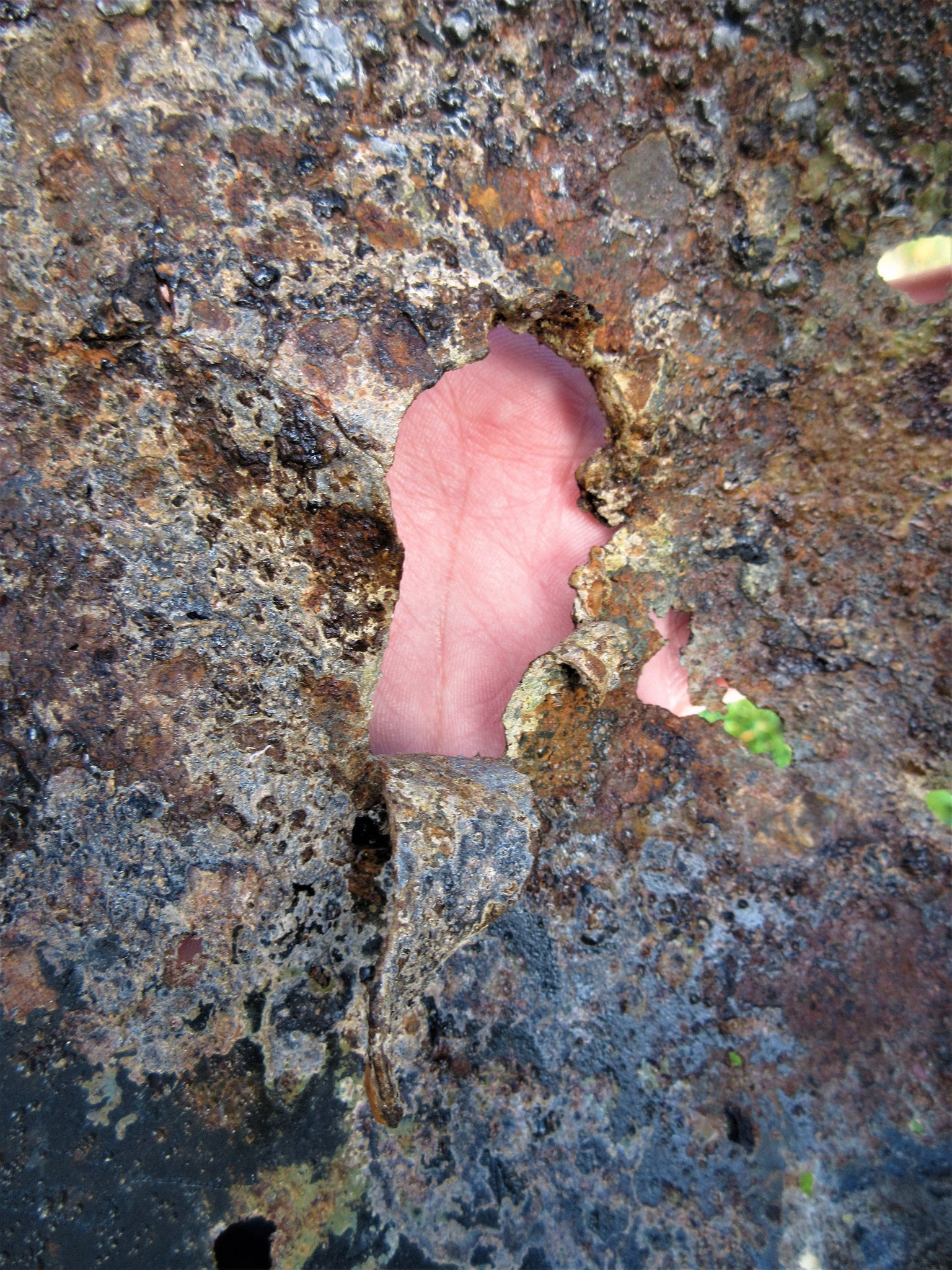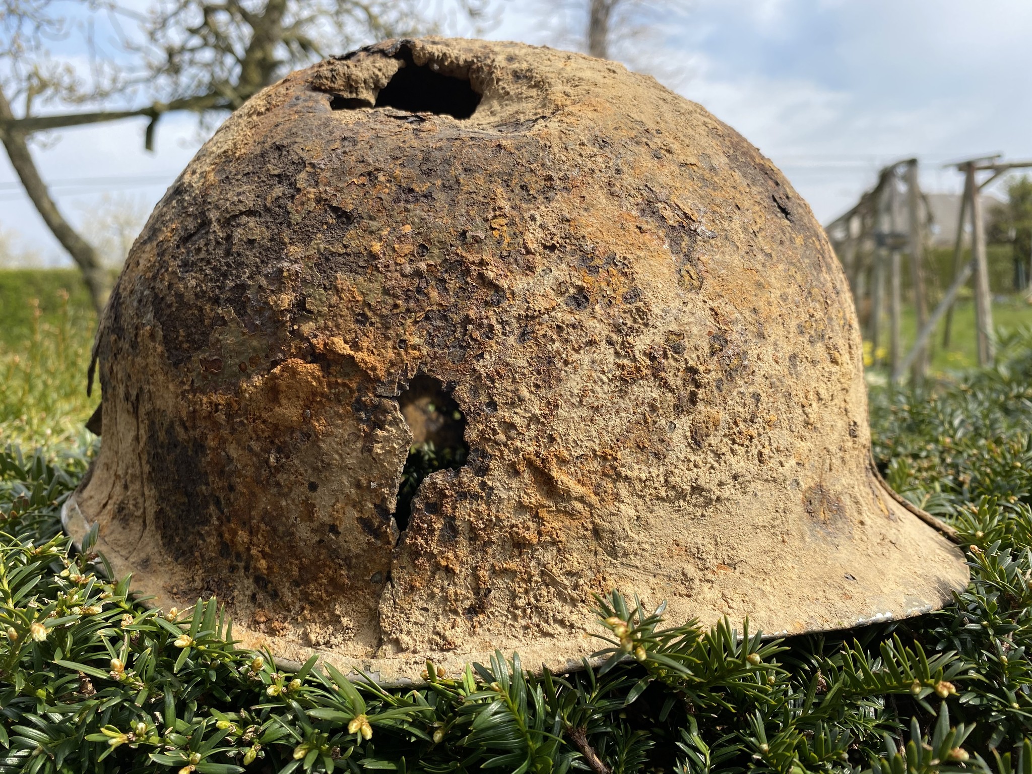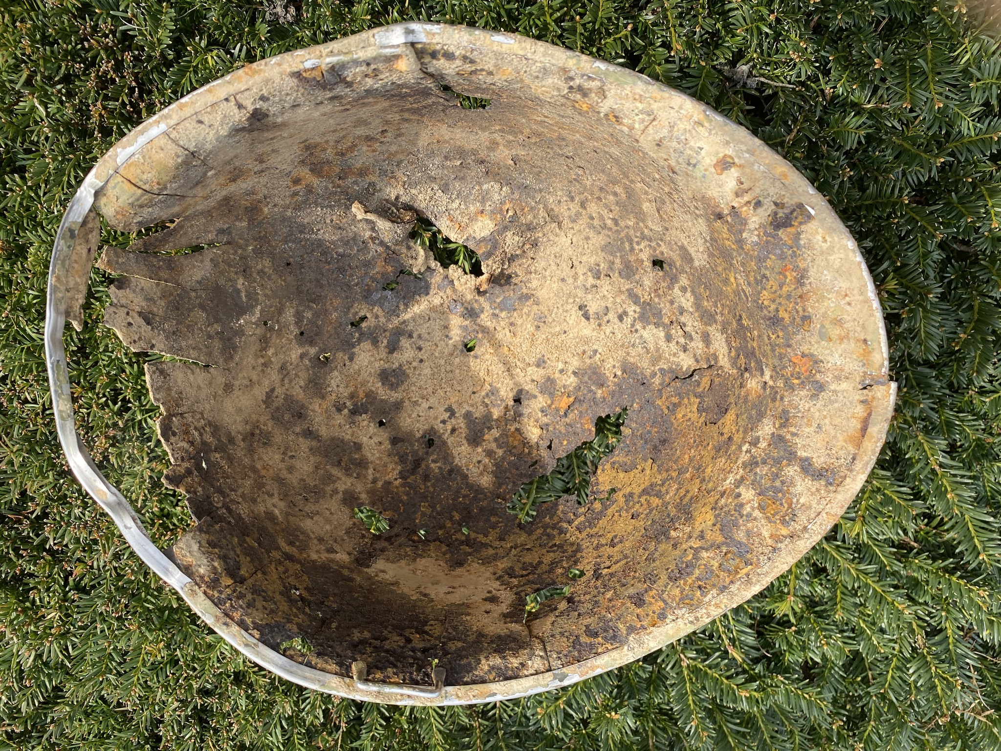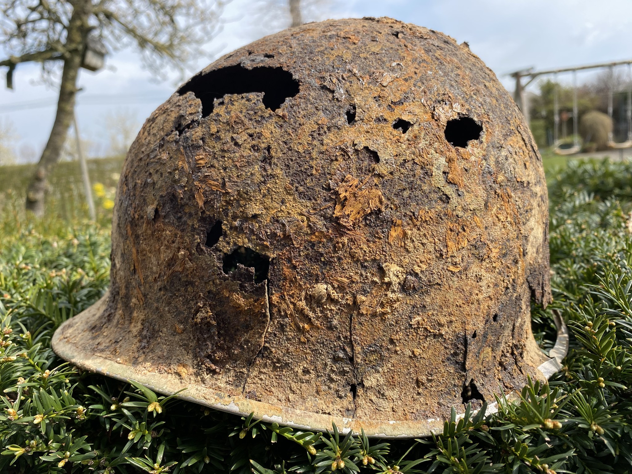 De scherf is rechtsboven ingeslagen en heeft aan de achterzijde de rand versplinterd. Het is te hopen dat een soldaat de helm toen niet op had want dit is niet te overleven lijkt me.