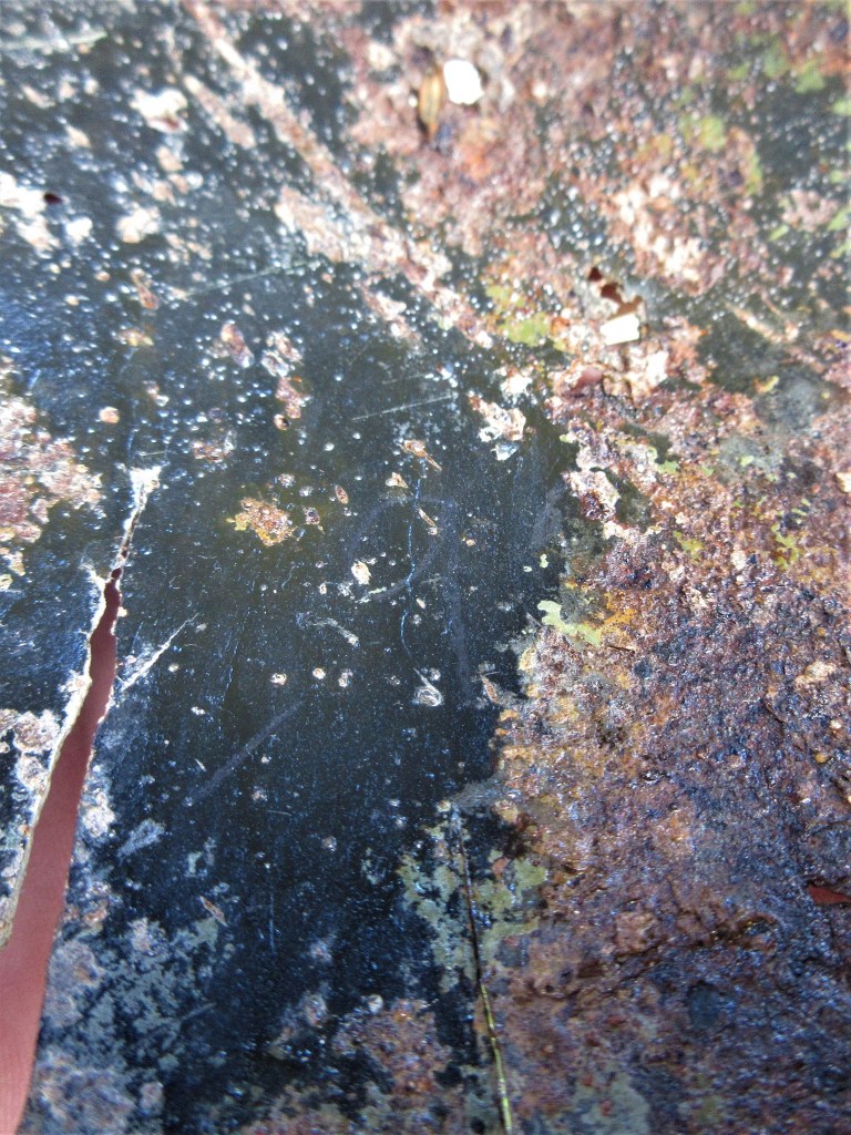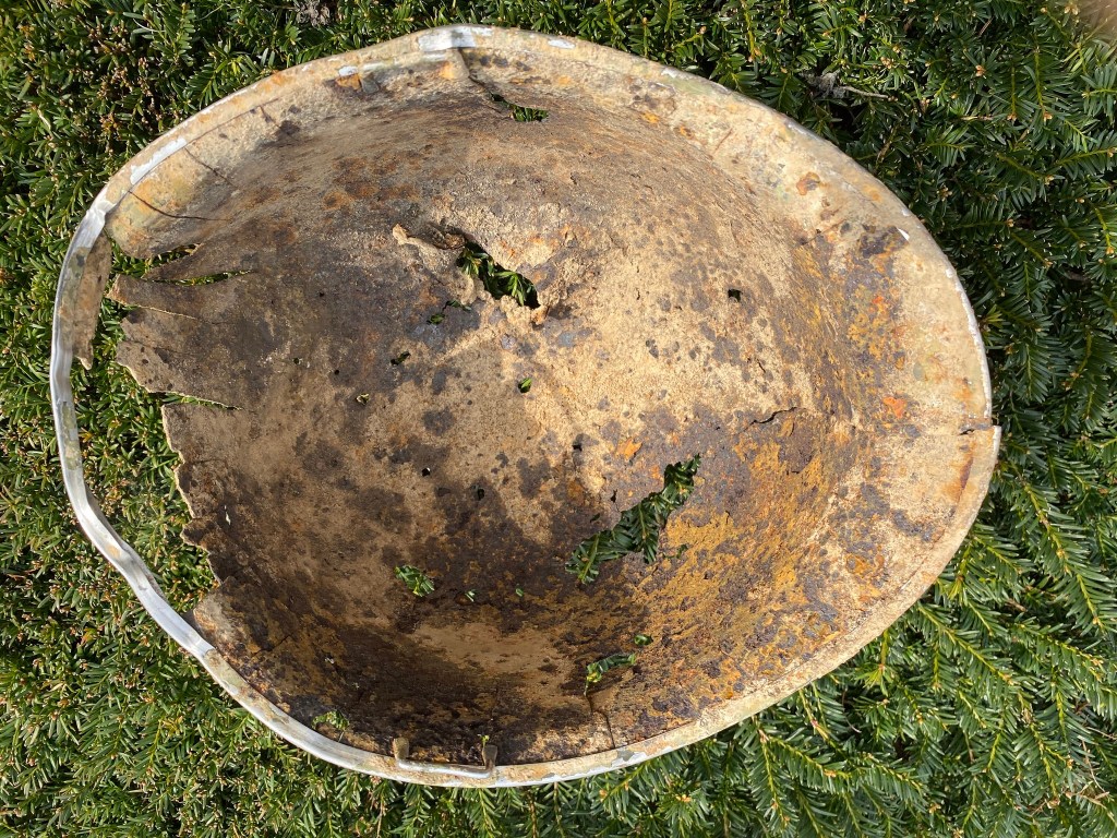 Aan de binnenzijde van de helm is met potlood wat geschreven geweest. Een streepje, een 9 of een g, en dan heeft de tand des tijds helaas toegeslagen, een andere letter of cijfer is niet meer te ontcijferen, laat staan wat er nog meer stond. Maar dat een simpel iets als een potloodstreep de tijd kan doorstaan is hoopvol. Geschiedenis kan ontdekt worden op de vreemdste plaatsen. Of soms heel dichtbij. Kijk eens in uw eigen omgeving, welke verhalen zijn er nog, welke tekenen in het landschap. Ga er op uit en ontdek!