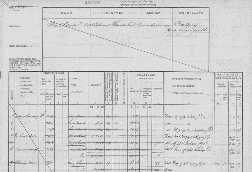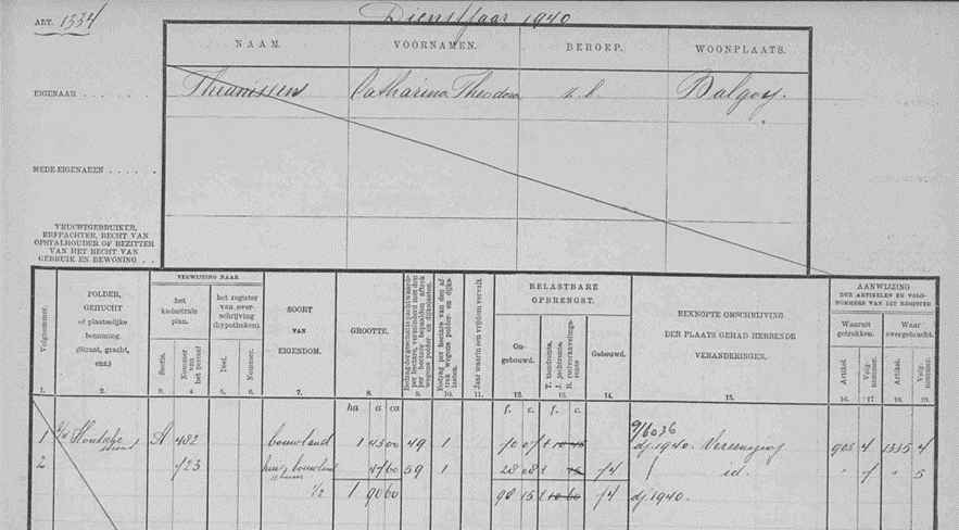 Kadastraal leggerartikkel 1334 waaruit blijkt dat in dj 1940 Cato Theunissen eigenaar is van het huis aan de Houtsestraat kadastraal Sectie A nummer 723In dj 1941 is er in leggerartikel 1335 nog een vermelding “verklaring” en in leggerartikel 1340 staat het huis op naam van Wilhelmus Hendrikus Willems, landbouwer te Balgoy, gemeente Overasselt, Houtsestraat 11