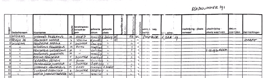 Bevolkingsregister Overasselt 1924 – 1930. Het gezin van Johannes Sigbertus Willemsfamilie Willems – de Bruijn: Jo, Dien, Wim, Jan, Drieka, Marietje, Nora, Toon, moeder Drieka, Pieta, Harrie en Gerrit in 1935 (Bron: Pieta Banken – Willems)