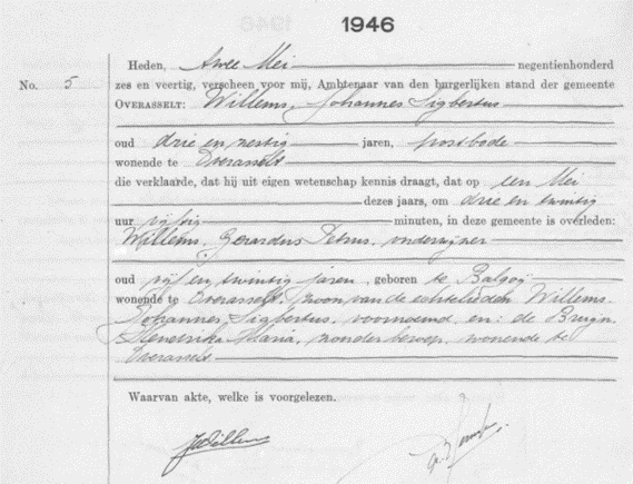 Overlijdensakte gemeente Overasselt 1946 Gerrit Willems. Ook in de overlijdensakte is terug te vinden dat het beroep van Gerrit onderwijzer was