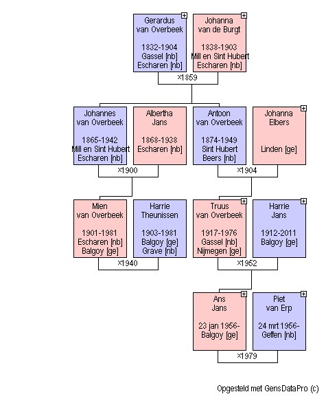 Geneagram waarin de relatie is weergegeven tussen Mien en Truus van Overbeek en hoe ik daardoor familie ben van Harrie en Mien Theunissen – van Overbeek.